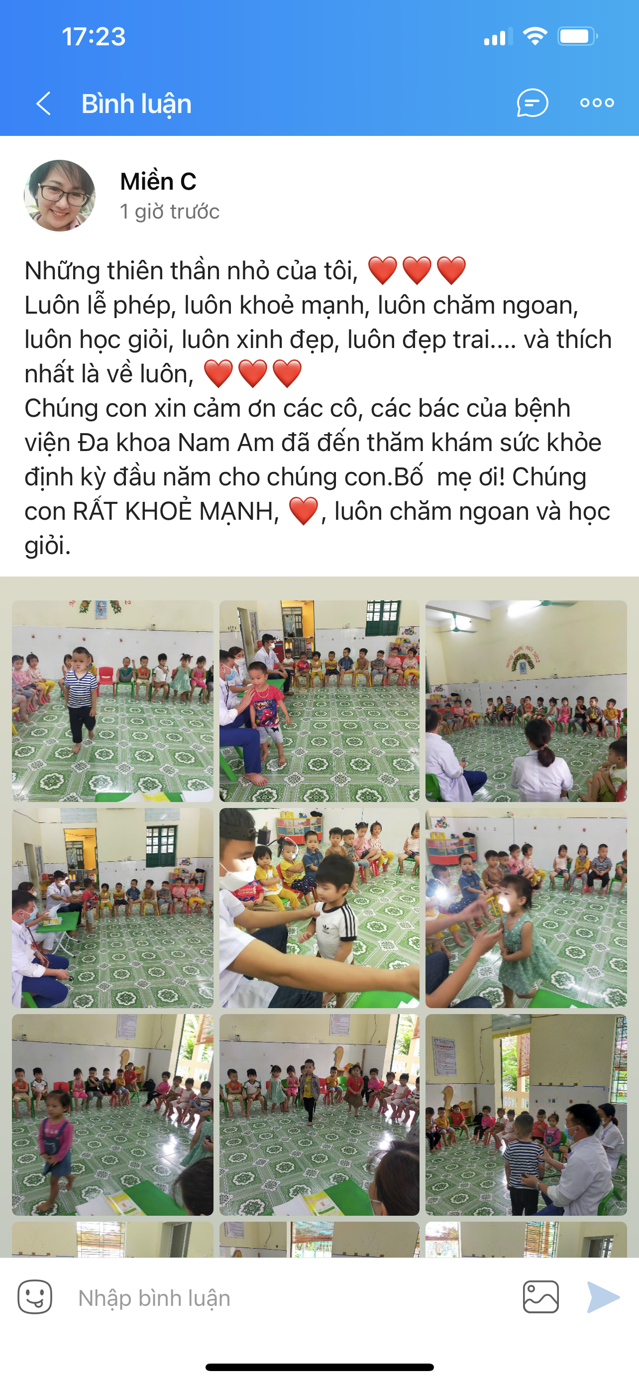 Thực hiện kế hoạch chăm sóc sức khỏe năm học 2023 - 2024, đúng 14h30 phút chiều thứ 3 ngày 10/10/2023 Đa khoa đã khám sức khỏe cho các cháu lần 1 năm học 2023 - 2024. Tại phòng học lớp nhà trẻ 1, các cháu đã được khám tổng quát về mắt, tai - mũi - họng, răng - hàm - mặt, hô hấp , tuần hoàn, thần kinh, lâm sàng... Cac bạn nhỏ trong lớp đã rất "hợp tác", bạn nào cũng ngoan ngoãn, k khóc nhè để các khám cho đấy. Cùng ngắm nhìn hình ảnh của các cháu trong buổi khám sức khỏe nhé.