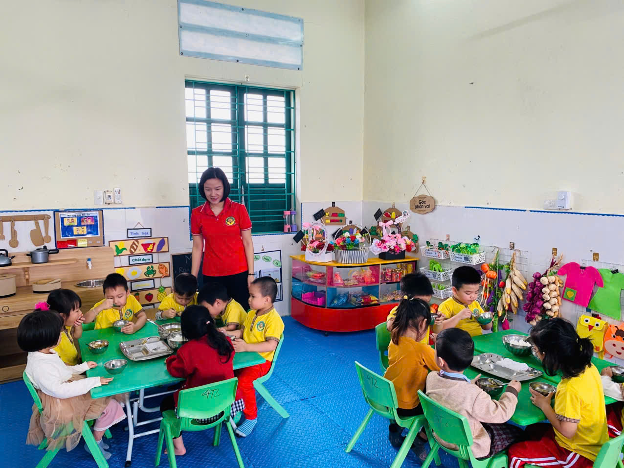 Giờ ăn trưa là một hoạt động quan trọng trong chế độ sinh hoạt hằng ngày của trẻ mầm non. Tại lớp, các bé được cô giáo hướng dẫn rửa tay sạch sẽ trước khi ăn, ngồi ngay ngắn và tự xúc ăn theo khả năng của mình. Trong bữa ăn, cô giáo luôn quan tâm, động viên để các con ăn ngon miệng, ăn hết suất, đồng thời nhẹ nhàng nhắc nhở trẻ giữ gìn vệ sinh, không nói chuyện to và biết mời cô, mời bạn trước khi ăn. Bữa ăn không chỉ giúp trẻ bổ sung đầy đủ dinh dưỡng để phát triển khỏe mạnh, mà còn rèn cho trẻ nề nếp, kỹ năng tự phục vụ và thói quen ăn uống khoa học. Với sự chăm sóc tận tình của cô giáo, giờ ăn trưa luôn diễn ra trong không khí vui vẻ, ấm áp, giúp các con cảm nhận được sự quan tâm và yêu thương mỗi ngày khi đến trường. 🌱