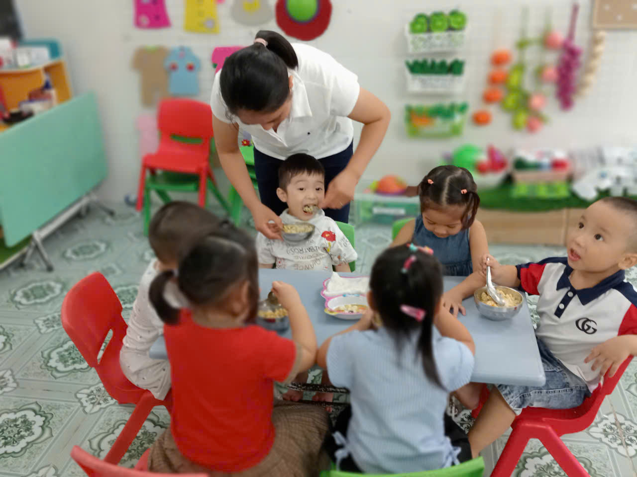 Giờ ăn trưa là một hoạt động quan trọng trong chế độ sinh hoạt hằng ngày của trẻ mầm non. Tại lớp, các bé được cô giáo hướng dẫn rửa tay sạch sẽ trước khi ăn, ngồi ngay ngắn và tự xúc ăn theo khả năng của mình. Trong bữa ăn, cô giáo luôn quan tâm, động viên để các con ăn ngon miệng, ăn hết suất, đồng thời nhẹ nhàng nhắc nhở trẻ giữ gìn vệ sinh, không nói chuyện to và biết mời cô, mời bạn trước khi ăn. Bữa ăn không chỉ giúp trẻ bổ sung đầy đủ dinh dưỡng để phát triển khỏe mạnh, mà còn rèn cho trẻ nề nếp, kỹ năng tự phục vụ và thói quen ăn uống khoa học. Với sự chăm sóc tận tình của cô giáo, giờ ăn trưa luôn diễn ra trong không khí vui vẻ, ấm áp, giúp các con cảm nhận được sự quan tâm và yêu thương mỗi ngày khi đến trường. 🌱