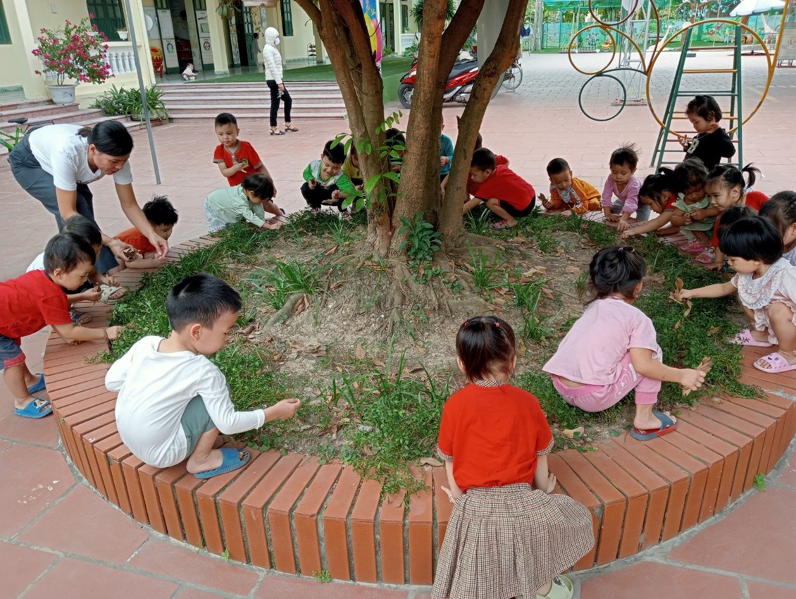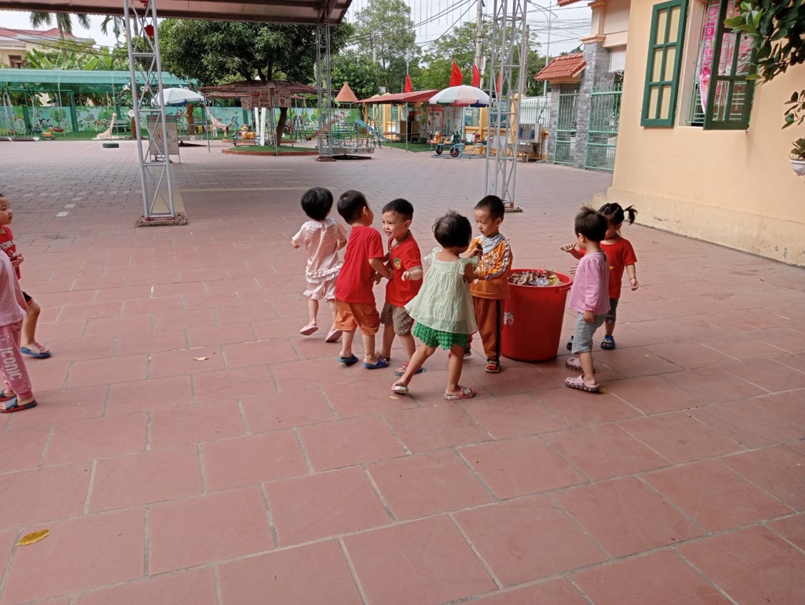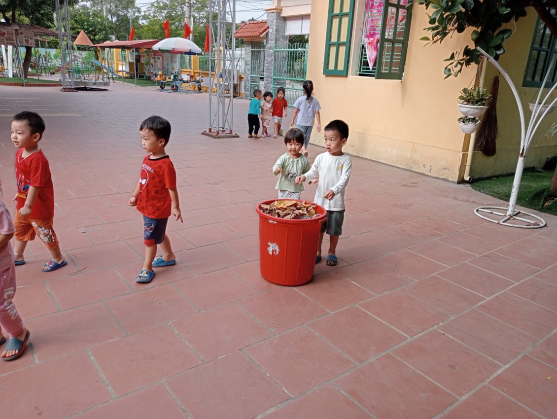 Các bé lớp 3T2 trong hoạt động ngoài trời nhặt, bỏ rác đúng nơi quy định