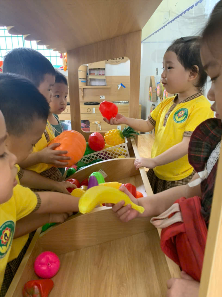 Hoạt động “chơi bán hàng” là một trò chơi đóng vai rất phù hợp với trẻ nhỏ, mang lại nhiều giá trị phát triển toàn diện: 1. Phát triển nhận thức Giúp trẻ nhận biết các đồ vật quen thuộc: rau, quả, bánh, sữa… Bước đầu hiểu được hoạt động mua – bán đơn giản trong cuộc sống. 2. Phát triển ngôn ngữ Trẻ học cách giao tiếp: chào hỏi, mời mua, nói lời cảm ơn. Tăng vốn từ và khả năng diễn đạt thông qua trò chơi. 3. Phát triển kỹ năng xã hội Trẻ biết chơi cùng bạn, chờ đến lượt, hợp tác với nhau. Hình thành hành vi giao tiếp lịch sự, mạnh dạn, tự tin hơn. 4. Phát triển tình cảm – cảm xúc Trẻ được nhập vai (người bán, người mua) nên rất hào hứng, vui vẻ. Tạo cảm giác thoải mái, giảm nhút nhát, tăng sự tự tin. 5. Phát triển vận động tinh Khi cầm, xếp, đưa – nhận đồ, trẻ rèn luyện sự khéo léo của đôi tay. 6. Giáo dục kỹ năng sống đơn giản Biết giữ gìn đồ chơi, sắp xếp gọn gàng “gian hàng”. Làm quen với hành vi tiêu dùng đơn giản (chọn đồ, trao đổi).