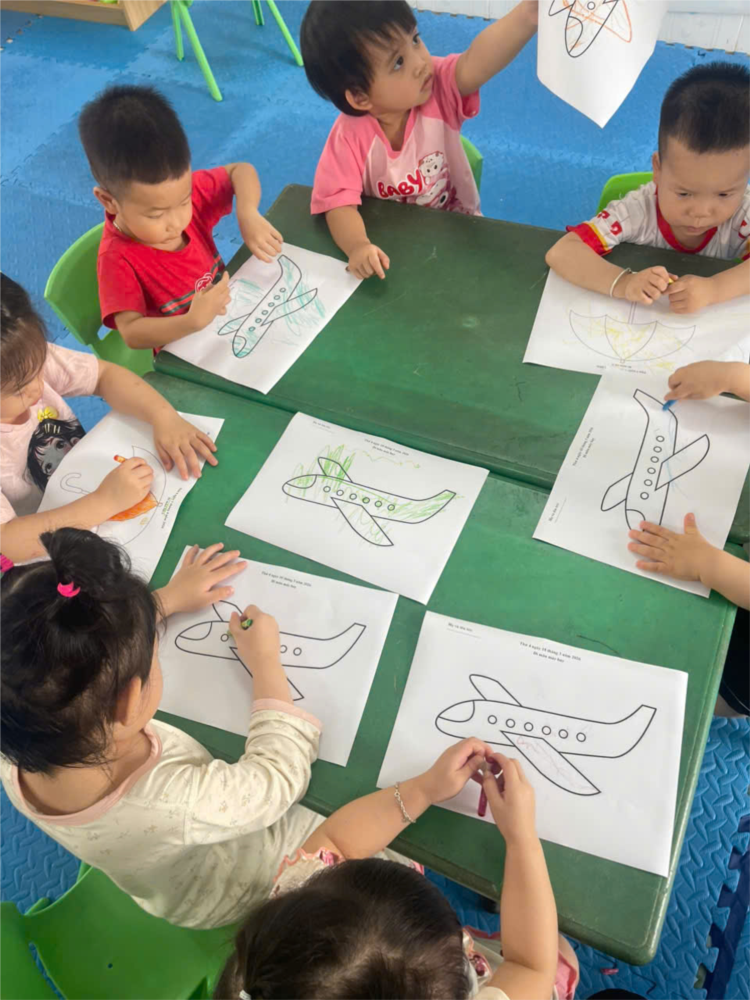 Các bé lớp NT1 cùng nhau di màu máy bay
