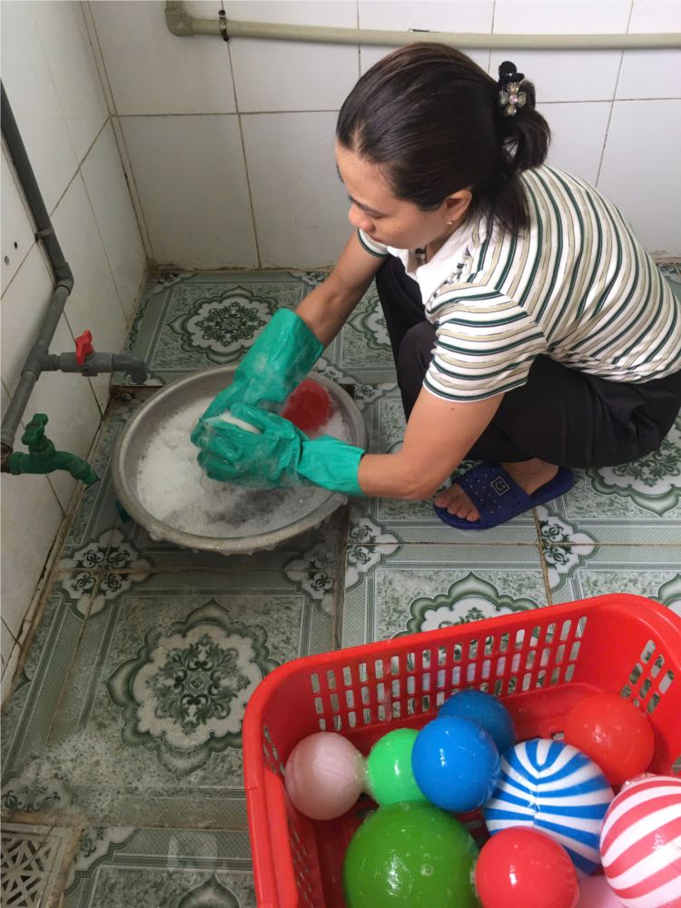 Công tác vệ sinh đồ dùng, đồ chơi của lớp NT1 trong phòng chống dịch bệnh