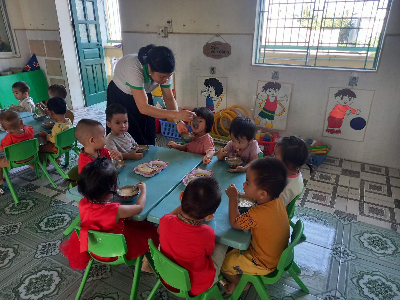 Giờ ăn trưa là một hoạt động quan trọng trong chế độ sinh hoạt hằng ngày của trẻ mầm non. Tại lớp, các bé được cô giáo hướng dẫn rửa tay sạch sẽ trước khi ăn, ngồi ngay ngắn và tự xúc ăn theo khả năng của mình. Trong bữa ăn, cô giáo luôn quan tâm, động viên để các con ăn ngon miệng, ăn hết suất, đồng thời nhẹ nhàng nhắc nhở trẻ giữ gìn vệ sinh, không nói chuyện to và biết mời cô, mời bạn trước khi ăn. Bữa ăn không chỉ giúp trẻ bổ sung đầy đủ dinh dưỡng để phát triển khỏe mạnh, mà còn rèn cho trẻ nề nếp, kỹ năng tự phục vụ và thói quen ăn uống khoa học. Với sự chăm sóc tận tình của cô giáo, giờ ăn trưa luôn diễn ra trong không khí vui vẻ, ấm áp, giúp các con cảm nhận được sự quan tâm và yêu thương mỗi ngày khi đến trường. 🌱