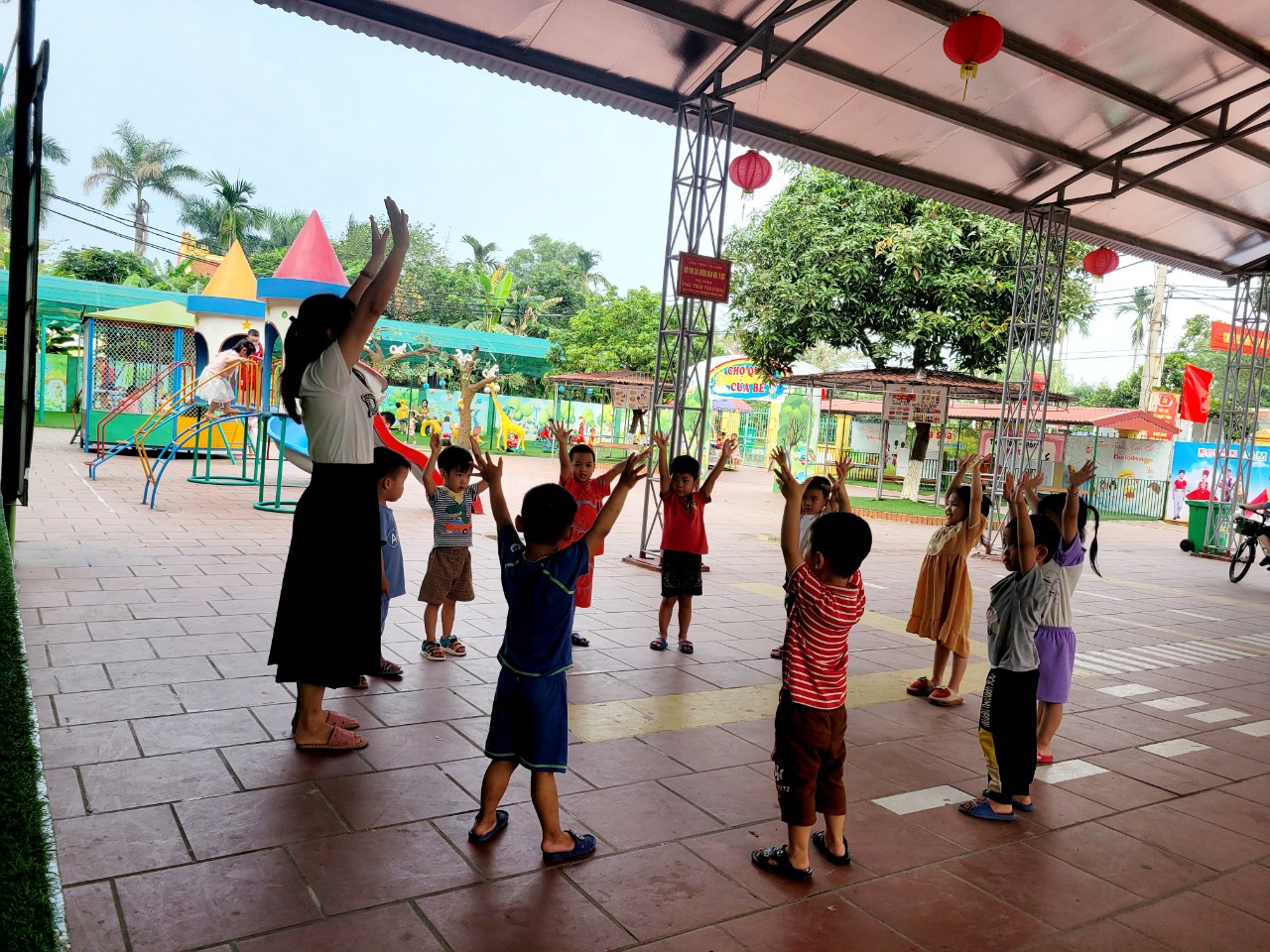 Thể dục sáng là một hoạt động rất quan trọng trong chế độ sinh hoạt hằng ngày của trẻ nhà trẻ, mang lại nhiều lợi ích thiết thực: 1. Phát triển thể chất Giúp cơ thể trẻ khỏe mạnh, tăng cường sức đề kháng. Phát triển các nhóm cơ, xương khớp, giúp trẻ nhanh nhẹn, dẻo dai hơn. Hỗ trợ phát triển chiều cao và thể lực. 2. Tạo tinh thần vui vẻ, hứng khởi Giúp trẻ tỉnh táo, sảng khoái khi bắt đầu một ngày mới. Tạo tâm lý vui vẻ, giảm quấy khóc, giúp trẻ dễ hòa nhập với lớp học. 3. Hình thành thói quen tốt Rèn cho trẻ thói quen vận động thường xuyên. Giáo dục trẻ nề nếp sinh hoạt khoa học, đúng giờ. 4. Phát triển kỹ năng vận động Giúp trẻ làm quen với các động tác cơ bản: đi, chạy, nhảy, giơ tay, cúi người… Tăng khả năng phối hợp tay – chân và sự khéo léo. 5. Tăng khả năng giao tiếp, hòa đồng Trẻ tham gia cùng cô và các bạn, từ đó mạnh dạn hơn. Hình thành tinh thần tập thể, biết làm theo hiệu lệnh.