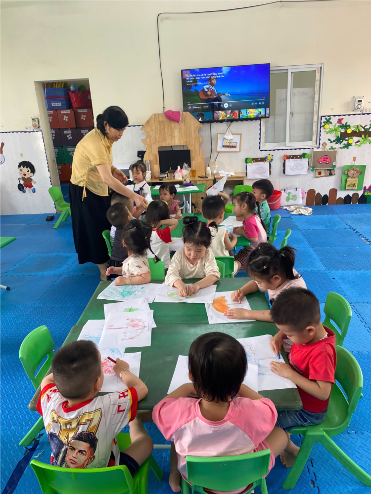 Hoạt động di màu chiếc ô cho trẻ nhà trẻ (24–36 tháng) có nhiều ý nghĩa quan trọng trong sự phát triển của trẻ: 🌱 1. Phát triển nhận thức Trẻ nhận biết được hình dạng chiếc ô (dù) quen thuộc trong cuộc sống. Hiểu công dụng của ô: che mưa, che nắng. Bước đầu nhận biết và phân biệt các màu sắc khác nhau. ✋ 2. Phát triển vận động tinh Rèn kỹ năng cầm bút màu, di màu trong khuôn hình. Giúp các cơ tay, ngón tay phát triển linh hoạt. Tăng khả năng phối hợp tay – mắt. 🎨 3. Phát triển thẩm mỹ Trẻ được tự do lựa chọn màu để tô chiếc ô theo ý thích. Hình thành cảm nhận về màu sắc, cái đẹp. Khuyến khích sự sáng tạo (ô có thể nhiều màu, trang trí theo ý trẻ). 🧠 4. Phát triển ngôn ngữ Trẻ học và gọi tên các màu sắc: đỏ, xanh, vàng… Biết nói những câu đơn giản: “Ô màu đỏ”, “Ô che mưa”. 🤝 5. Phát triển kỹ năng xã hội Trẻ học cách ngồi học ngay ngắn, chú ý nghe cô hướng dẫn. Biết giữ gìn đồ dùng học tập, không làm bẩn, không tranh giành. Hình thành tính kiên trì, tập trung khi hoàn thành sản phẩm. ☔ 6. Giáo dục kỹ năng sống Giúp trẻ biết sử dụng ô khi trời mưa hoặc nắng. Hình thành thói quen tự bảo vệ bản thân trước thời tiết.