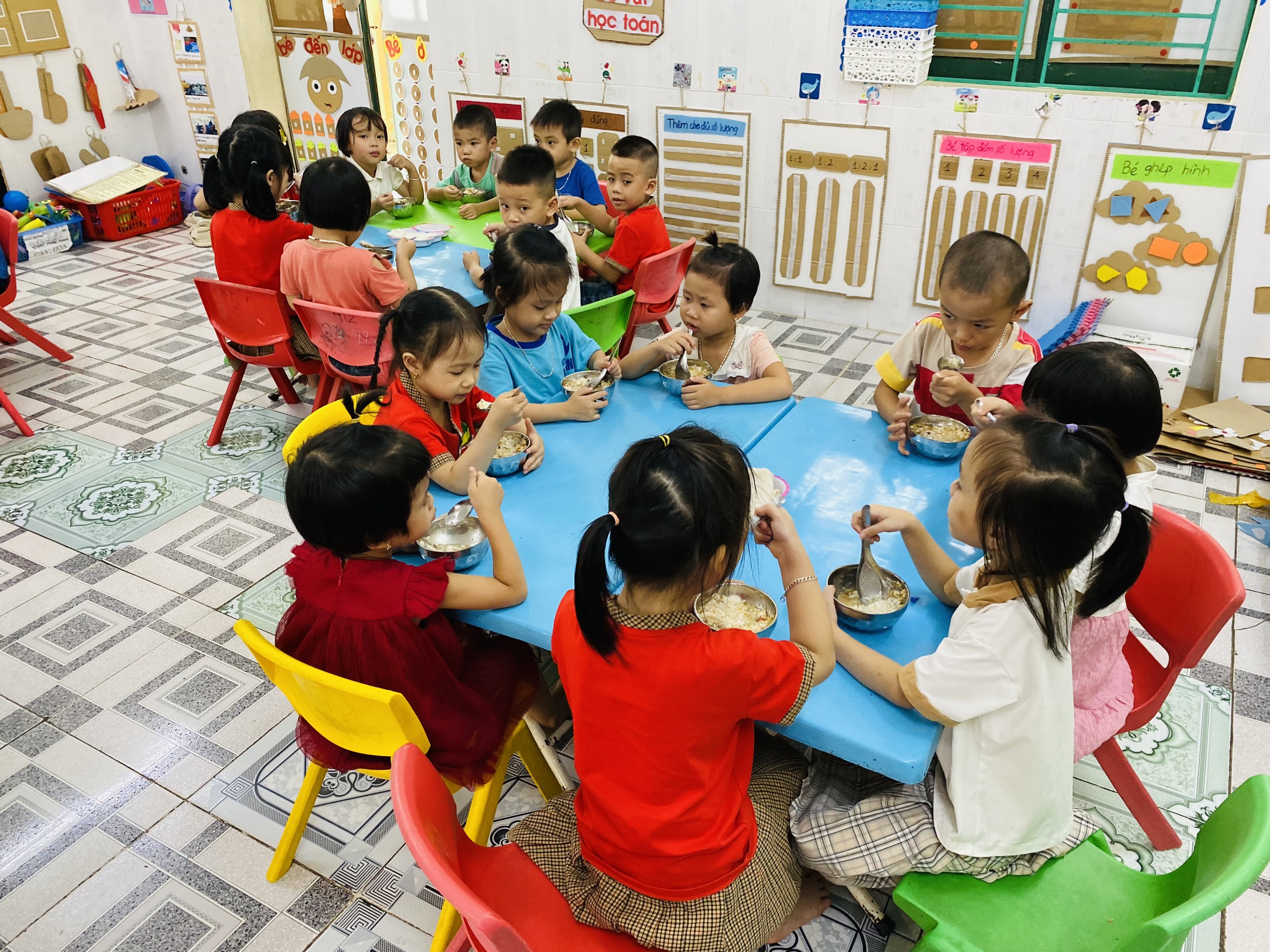 Giờ ăn trưa là một hoạt động quan trọng trong chế độ sinh hoạt hằng ngày của trẻ mầm non. Tại lớp, các bé được cô giáo hướng dẫn rửa tay sạch sẽ trước khi ăn, ngồi ngay ngắn và tự xúc ăn theo khả năng của mình. Trong bữa ăn, cô giáo luôn quan tâm, động viên để các con ăn ngon miệng, ăn hết suất, đồng thời nhẹ nhàng nhắc nhở trẻ giữ gìn vệ sinh, không nói chuyện to và biết mời cô, mời bạn trước khi ăn. Bữa ăn không chỉ giúp trẻ bổ sung đầy đủ dinh dưỡng để phát triển khỏe mạnh, mà còn rèn cho trẻ nề nếp, kỹ năng tự phục vụ và thói quen ăn uống khoa học. Với sự chăm sóc tận tình của cô giáo, giờ ăn trưa luôn diễn ra trong không khí vui vẻ, ấm áp, giúp các con cảm nhận được sự quan tâm và yêu thương mỗi ngày khi đến trường. 🌱