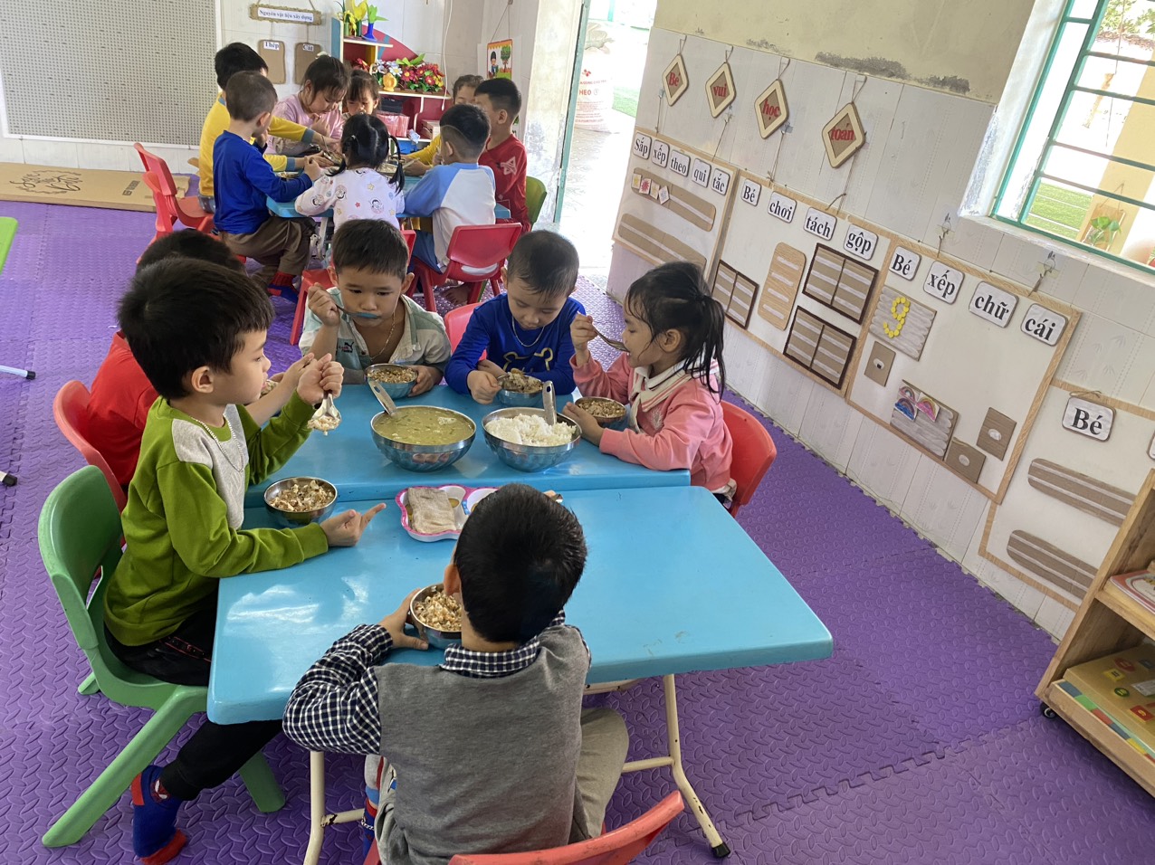 Giờ ăn trưa là một hoạt động quan trọng trong chế độ sinh hoạt hằng ngày của trẻ mầm non. Tại lớp, các bé được cô giáo hướng dẫn rửa tay sạch sẽ trước khi ăn, ngồi ngay ngắn và tự xúc ăn theo khả năng của mình. Trong bữa ăn, cô giáo luôn quan tâm, động viên để các con ăn ngon miệng, ăn hết suất, đồng thời nhẹ nhàng nhắc nhở trẻ giữ gìn vệ sinh, không nói chuyện to và biết mời cô, mời bạn trước khi ăn. Bữa ăn không chỉ giúp trẻ bổ sung đầy đủ dinh dưỡng để phát triển khỏe mạnh, mà còn rèn cho trẻ nề nếp, kỹ năng tự phục vụ và thói quen ăn uống khoa học. Với sự chăm sóc tận tình của cô giáo, giờ ăn trưa luôn diễn ra trong không khí vui vẻ, ấm áp, giúp các con cảm nhận được sự quan tâm và yêu thương mỗi ngày khi đến trường. 🌱