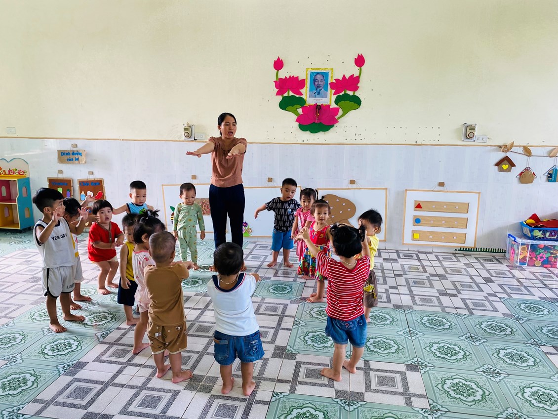 Giò thể dục sáng rất quan trọng với sự phát triển thể chất của trẻ nhà trẻ. Cô hướng dẫn trẻ tập thể dục sáng , trẻ vui vẻ hào hứng tham gia hoạt động