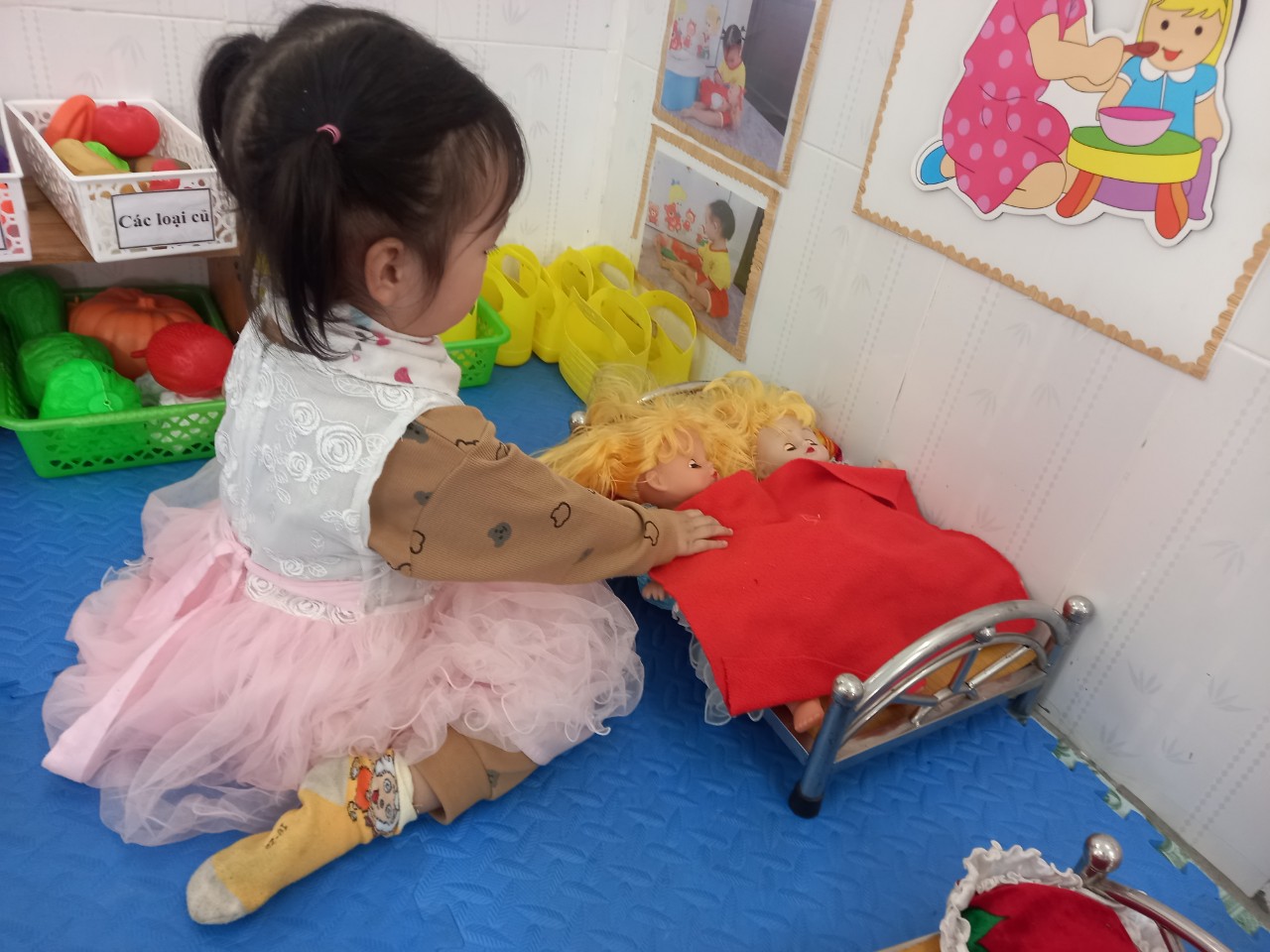 Các bé lớp NT2 được cô giáo hướng dẫn rất nhiều các hoạt động và hôm nay các bạn nhỏ đã tự mình làm một cách thuần thục các bạn đã biết bế em cho em ngủ và biết quan tâm chăm sóc đắp chăn cho em nữa đấy. Qua đây thể hiện được tình cảm của các bạn nhỏ với em bé