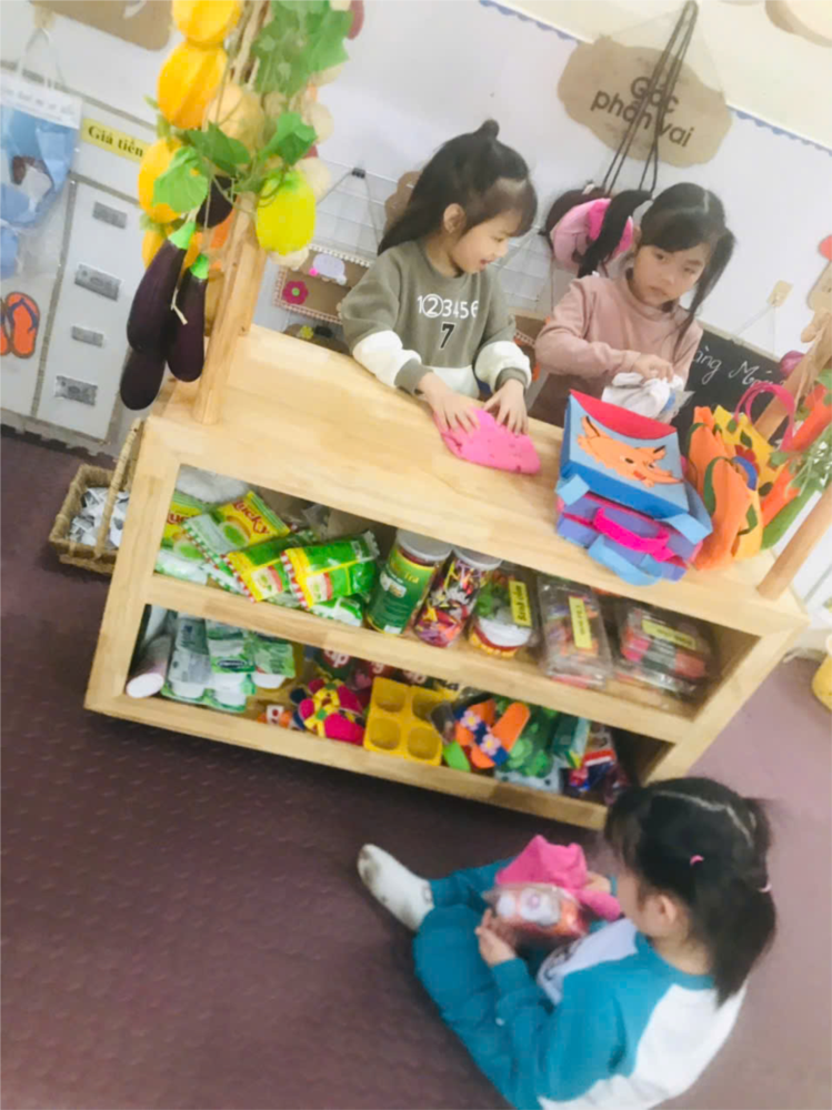 Hoạt động “chơi bán hàng” là một trò chơi đóng vai rất phù hợp với trẻ nhỏ, mang lại nhiều giá trị phát triển toàn diện: 1. Phát triển nhận thức Giúp trẻ nhận biết các đồ vật quen thuộc: rau, quả, bánh, sữa… Bước đầu hiểu được hoạt động mua – bán đơn giản trong cuộc sống. 2. Phát triển ngôn ngữ Trẻ học cách giao tiếp: chào hỏi, mời mua, nói lời cảm ơn. Tăng vốn từ và khả năng diễn đạt thông qua trò chơi. 3. Phát triển kỹ năng xã hội Trẻ biết chơi cùng bạn, chờ đến lượt, hợp tác với nhau. Hình thành hành vi giao tiếp lịch sự, mạnh dạn, tự tin hơn. 4. Phát triển tình cảm – cảm xúc Trẻ được nhập vai (người bán, người mua) nên rất hào hứng, vui vẻ. Tạo cảm giác thoải mái, giảm nhút nhát, tăng sự tự tin. 5. Phát triển vận động tinh Khi cầm, xếp, đưa – nhận đồ, trẻ rèn luyện sự khéo léo của đôi tay. 6. Giáo dục kỹ năng sống đơn giản Biết giữ gìn đồ chơi, sắp xếp gọn gàng “gian hàng”. Làm quen với hành vi tiêu dùng đơn giản (chọn đồ, trao đổi).