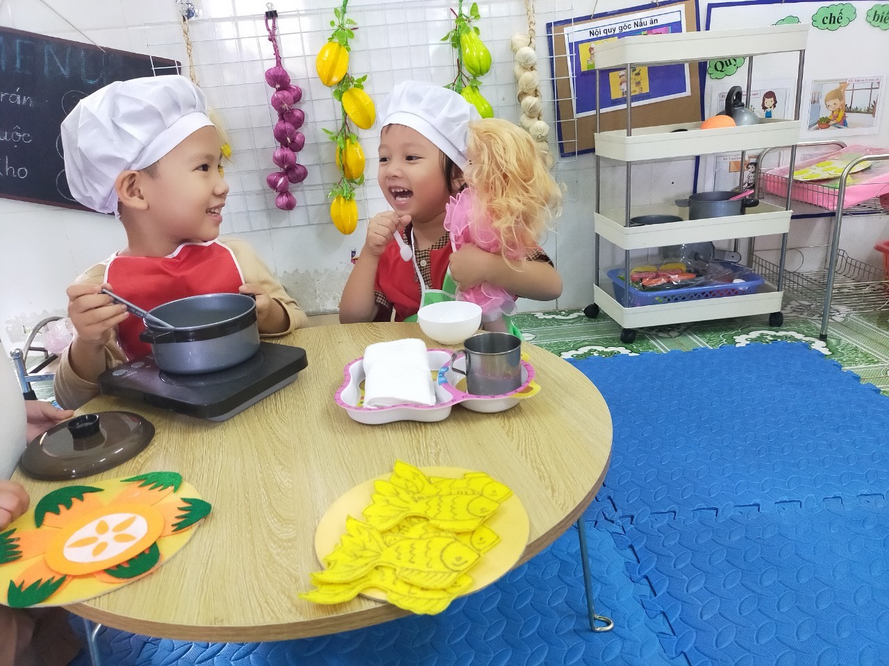 Hoạt động “chơi bán hàng” là một trò chơi đóng vai rất phù hợp với trẻ nhỏ, mang lại nhiều giá trị phát triển toàn diện: 1. Phát triển nhận thức Giúp trẻ nhận biết các đồ vật quen thuộc: rau, quả, bánh, sữa… Bước đầu hiểu được hoạt động mua – bán đơn giản trong cuộc sống. 2. Phát triển ngôn ngữ Trẻ học cách giao tiếp: chào hỏi, mời mua, nói lời cảm ơn. Tăng vốn từ và khả năng diễn đạt thông qua trò chơi. 3. Phát triển kỹ năng xã hội Trẻ biết chơi cùng bạn, chờ đến lượt, hợp tác với nhau. Hình thành hành vi giao tiếp lịch sự, mạnh dạn, tự tin hơn. 4. Phát triển tình cảm – cảm xúc Trẻ được nhập vai (người bán, người mua) nên rất hào hứng, vui vẻ. Tạo cảm giác thoải mái, giảm nhút nhát, tăng sự tự tin. 5. Phát triển vận động tinh Khi cầm, xếp, đưa – nhận đồ, trẻ rèn luyện sự khéo léo của đôi tay. 6. Giáo dục kỹ năng sống đơn giản Biết giữ gìn đồ chơi, sắp xếp gọn gàng “gian hàng”. Làm quen với hành vi tiêu dùng đơn giản (chọn đồ, trao đổi).