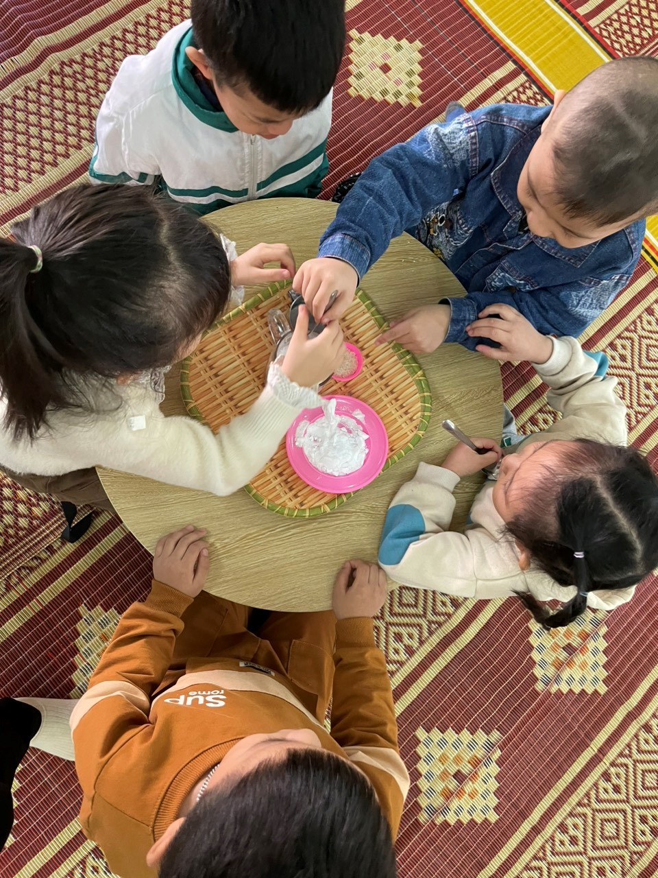 Giờ ăn trưa là một hoạt động quan trọng trong chế độ sinh hoạt hằng ngày của trẻ mầm non. Tại lớp, các bé được cô giáo hướng dẫn rửa tay sạch sẽ trước khi ăn, ngồi ngay ngắn và tự xúc ăn theo khả năng của mình. Trong bữa ăn, cô giáo luôn quan tâm, động viên để các con ăn ngon miệng, ăn hết suất, đồng thời nhẹ nhàng nhắc nhở trẻ giữ gìn vệ sinh, không nói chuyện to và biết mời cô, mời bạn trước khi ăn. Bữa ăn không chỉ giúp trẻ bổ sung đầy đủ dinh dưỡng để phát triển khỏe mạnh, mà còn rèn cho trẻ nề nếp, kỹ năng tự phục vụ và thói quen ăn uống khoa học. Với sự chăm sóc tận tình của cô giáo, giờ ăn trưa luôn diễn ra trong không khí vui vẻ, ấm áp, giúp các con cảm nhận được sự quan tâm và yêu thương mỗi ngày khi đến trường. 🌱