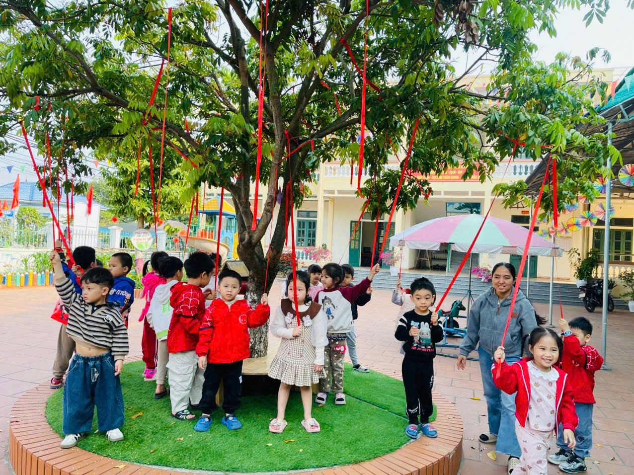 Trong hoạt động ngoài trời hôm nay, các bé lớp 4 tuổi được tham gia trải nghiệm thú vị chơi dưới gốc “cây ước nguyện” trong sân trường. Dưới tán cây xanh mát, những dải ruy băng đỏ được treo lên như những điều ước nhỏ xinh của các con. Mỗi bạn nhỏ đều rất hào hứng khi được cầm những dải ruy băng, cùng nhau vui chơi, trò chuyện và chia sẻ những mong ước ngây thơ của mình. Hoạt động không chỉ mang lại niềm vui mà còn giúp trẻ phát triển kỹ năng giao tiếp, tăng cường sự tự tin và gắn kết với bạn bè. Thông qua những hoạt động ngoài trời như vậy, trẻ được vận động, hít thở không khí trong lành, khám phá môi trường xung quanh, từ đó giúp cơ thể khỏe mạnh và tinh thần luôn vui tươi. Dưới “cây ước nguyện”, những tiếng cười trong trẻo của các bé vang lên khắp sân trường, tạo nên một không gian ấm áp, hồn nhiên và tràn đầy niềm vui tuổi thơ. 🌳✨