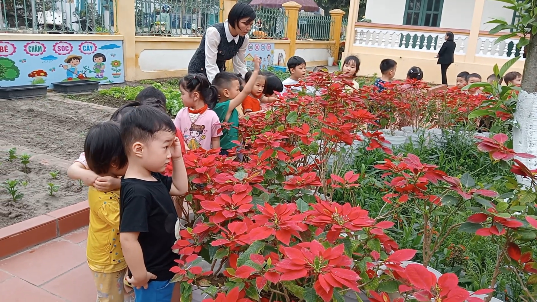 Trẻ mầm non “Học mà chơi – chơi mà học”. Vui chơi là hoạt động chủ đạo của lứa tuổi mầm non, mà trong đó vui chơi ngoài trời là một hoạt động không thể thiếu được với trẻ. Tham gia hoạt động ngoài trời, trẻ sẽ được hít thở không khí trong lành, được quan sát thế giới xung quanh, được khám phá những điều mới lạ từ thiên nhiên, được tự do hoạt động theo ý thích, tích lũy kiến thức, rèn luyện các kỹ năng và tăng thêm vốn kinh nghiệm sống cho bản thân. Môi trường cho trẻ hoạt động ngoài trời là một môi trường hấp dẫn và lôi cuốn trẻ nếu chúng ta biết nắm bắt và tận dụng tất cả những yếu tố có sẵn trong thiên nhiên, tác động vào chúng qua các trò chơi, quan sát, tìm hiểu sự vật xung quanh trẻ trong các tình huống. Những câu hỏi như: Vì sao? Làm thế nào?… và sự tò mò ham hiểu biết của trẻ, sẽ giúp giáo viên hình thành hành vi đẹp, thói quen tốt cho trẻ. Sau đây là một số hình ảnh của các bé lớp 3T2 trong hoạt động " quan sát hoa trạng nguyên"