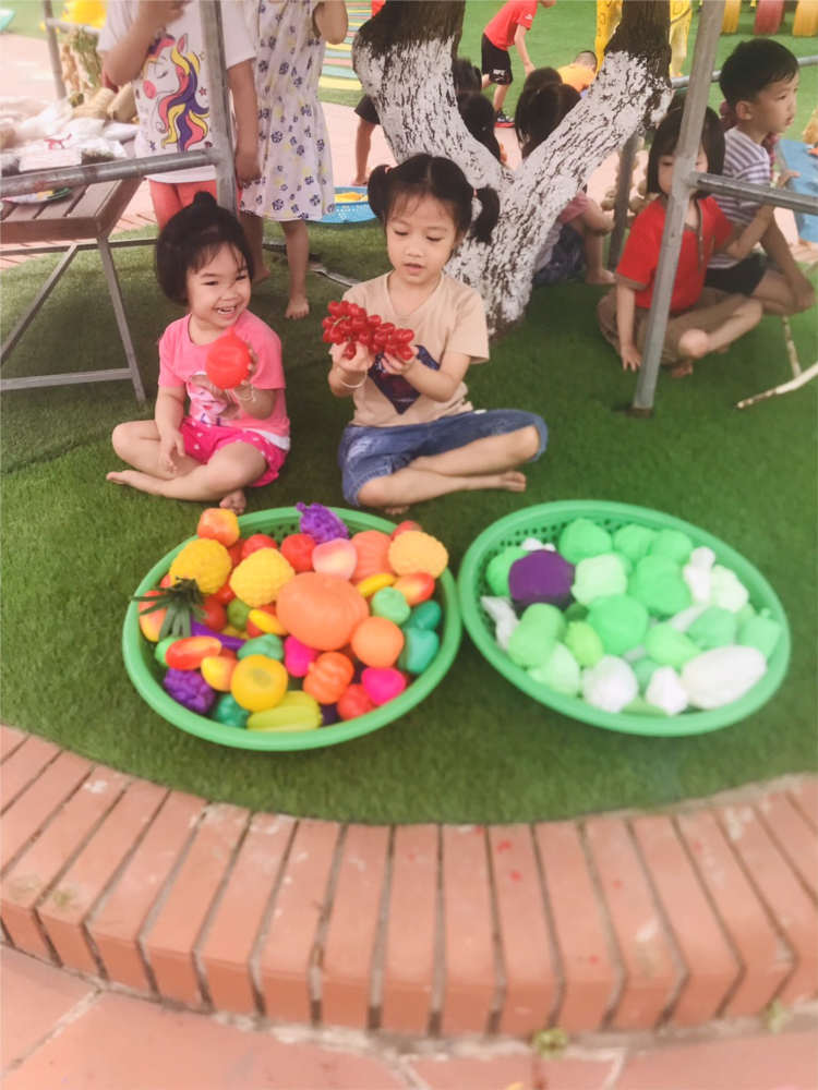 Hoạt động “chơi bán hàng” là một trò chơi đóng vai rất phù hợp với trẻ nhỏ, mang lại nhiều giá trị phát triển toàn diện: 1. Phát triển nhận thức Giúp trẻ nhận biết các đồ vật quen thuộc: rau, quả, bánh, sữa… Bước đầu hiểu được hoạt động mua – bán đơn giản trong cuộc sống. 2. Phát triển ngôn ngữ Trẻ học cách giao tiếp: chào hỏi, mời mua, nói lời cảm ơn. Tăng vốn từ và khả năng diễn đạt thông qua trò chơi. 3. Phát triển kỹ năng xã hội Trẻ biết chơi cùng bạn, chờ đến lượt, hợp tác với nhau. Hình thành hành vi giao tiếp lịch sự, mạnh dạn, tự tin hơn. 4. Phát triển tình cảm – cảm xúc Trẻ được nhập vai (người bán, người mua) nên rất hào hứng, vui vẻ. Tạo cảm giác thoải mái, giảm nhút nhát, tăng sự tự tin. 5. Phát triển vận động tinh Khi cầm, xếp, đưa – nhận đồ, trẻ rèn luyện sự khéo léo của đôi tay. 6. Giáo dục kỹ năng sống đơn giản Biết giữ gìn đồ chơi, sắp xếp gọn gàng “gian hàng”. Làm quen với hành vi tiêu dùng đơn giản (chọn đồ, trao đổi).