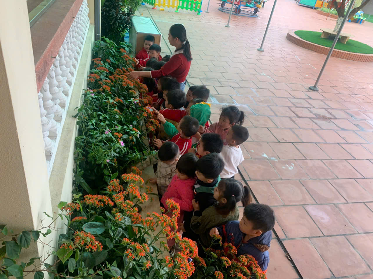 Hoạt động ngoài trời quan sát cây lá bỏng mang lại nhiều lợi ích cho trẻ 3 tuổi, giúp trẻ khám phá thiên nhiên và phát triển kỹ năng quan sát. Khi quan sát cây lá bỏng, trẻ được tìm hiểu về các bộ phận của cây như thân, lá, cành, hoa và nhận biết sự thay đổi của cây theo thời gian. Trẻ cũng hiểu được vai trò của cây trong việc tạo cảnh đẹp, cung cấp không khí trong lành và bảo vệ môi trường. Hoạt động này không chỉ kích thích sự tò mò, rèn luyện tư duy mà còn giúp trẻ phát triển ngôn ngữ khi mô tả những gì mình nhìn thấy. Đồng thời, việc tiếp xúc với thiên nhiên còn giúp trẻ vui vẻ, thoải mái và hình thành tình yêu đối với cây xanh, từ đó có ý thức chăm sóc, bảo vệ môi trường từ nhỏ. Sau đây là một số hình ảnh của các bé lớp 3T2 quan sát cây lá bỏng.
