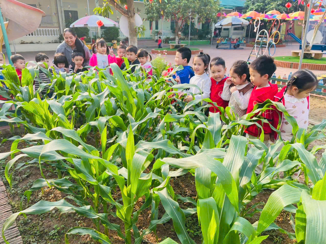 Trong hoạt động ngoài trời, các bé lớp 4 tuổi được cùng cô tham quan vườn rau của trường, quan sát những cây ngô xanh tốt đang lớn lên từng ngày. Các con hào hứng chạm tay vào lá, tìm hiểu về cây và trò chuyện cùng cô, cùng bạn. Hoạt động giúp trẻ gần gũi với thiên nhiên, biết yêu quý cây xanh và hình thành ý thức chăm sóc, bảo vệ môi trường ngay từ nhỏ. 🌱