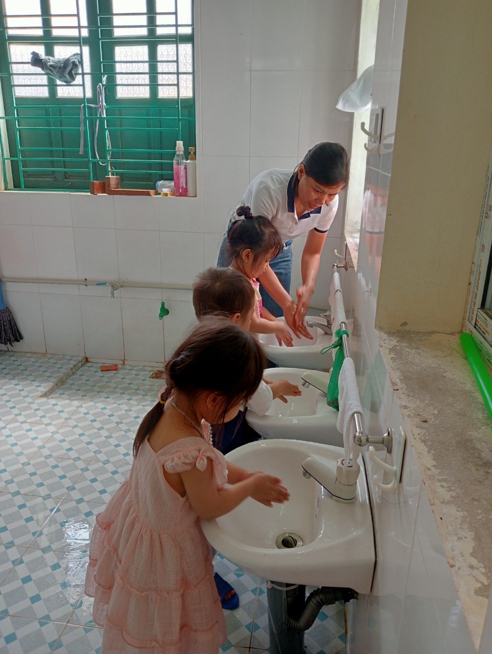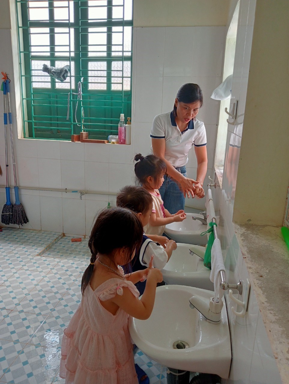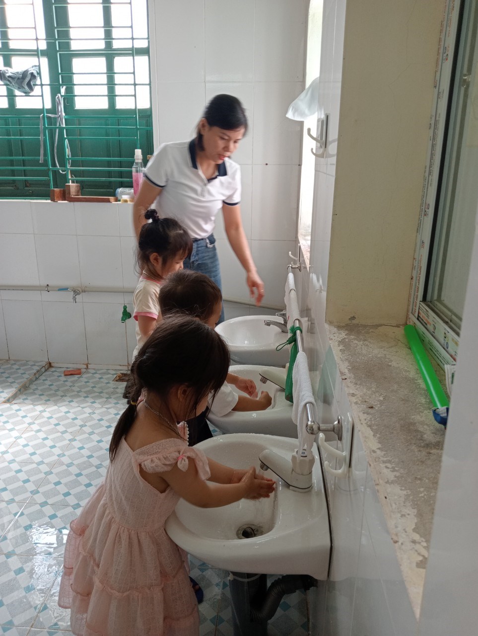 Chăm sóc sức khỏe trẻ thơ là công việc của toàn xã hội. Trẻ em nếu được chăm sóc nuôi dưỡng đầy đủ sẽ ít ốm đau bệnh tật và phát triển tốt. Công tác chăm sóc giáo dục vệ sinh cá nhân trẻ trong độ tuổi mầm non là việc làm thiết thực nhằm giúp trẻ có nền nếp thói quen vệ sinh, phòng tránh bệnh tật, tăng cường sức khỏe, hình thành những kỹ năng sống cơ bản đầu tiên, góp phần tạo nguồn lực có chất lượng trong tương lai. Các bé lớp 3T3 thực hiện giờ về sinh rửa tay trước khi ăn cơm.