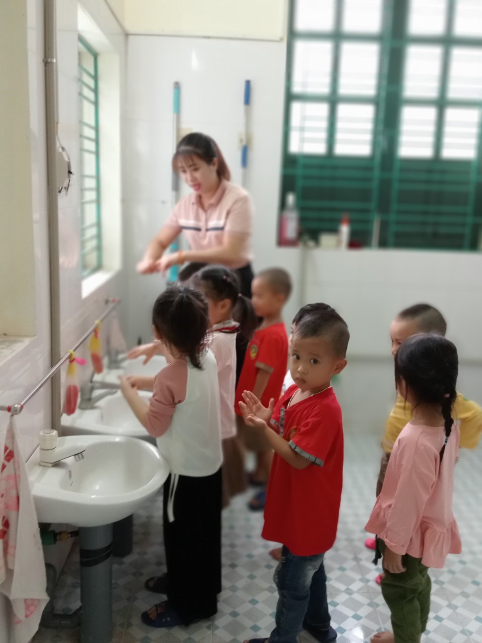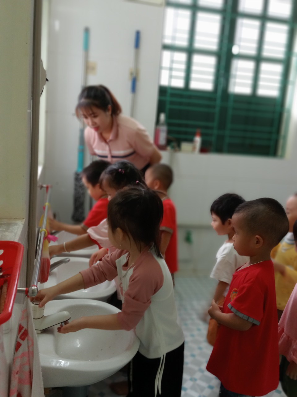 Dạy bé rửa tay đúng cách. Cần phải dạy cho bé thói quen rửa tay. Rửa tay giúp ngăn ngừa nhiều bệnh truyền nhiễm khác, đặc biệt là ở trẻ nhỏ. Nếu bạn rửa tay thường xuyên và đúng cách, bạn có thể giảm nguy cơ mắc bệnh cho chính mình. Vì thế, chúng ta nên tạo thói quen rửa tay cho trẻ khi chúng đến trường, rửa tay trước và sau khi ăn, sau khi đi vệ sinh, cuối cùng rửa tay trước khi rời trường học về nhà. Sau đây là một số hình ảnh rửa tay của các bé lớp 3T2.
