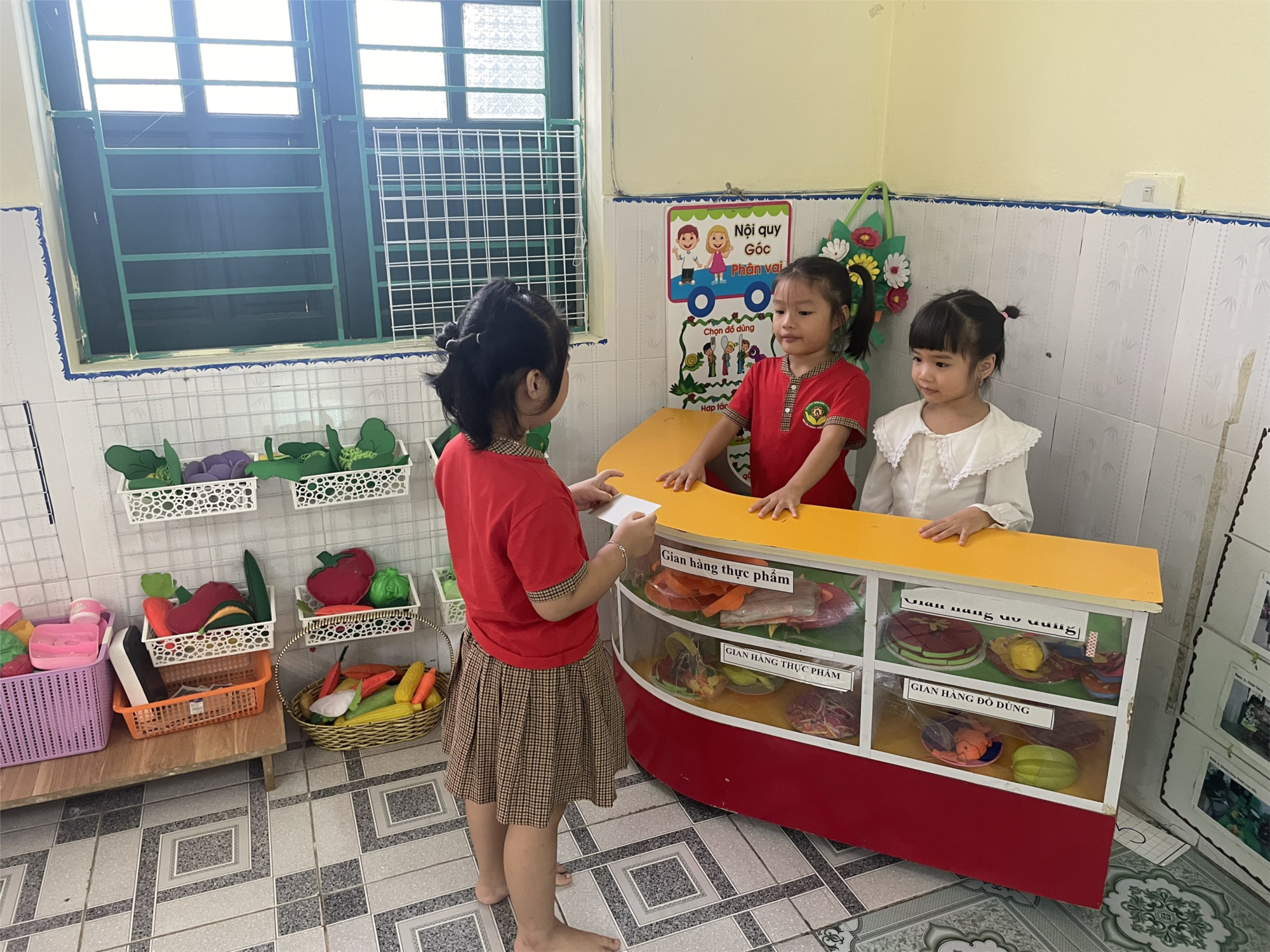 Hoạt động “chơi bán hàng” là một trò chơi đóng vai rất phù hợp với trẻ nhỏ, mang lại nhiều giá trị phát triển toàn diện: 1. Phát triển nhận thức Giúp trẻ nhận biết các đồ vật quen thuộc: rau, quả, bánh, sữa… Bước đầu hiểu được hoạt động mua – bán đơn giản trong cuộc sống. 2. Phát triển ngôn ngữ Trẻ học cách giao tiếp: chào hỏi, mời mua, nói lời cảm ơn. Tăng vốn từ và khả năng diễn đạt thông qua trò chơi. 3. Phát triển kỹ năng xã hội Trẻ biết chơi cùng bạn, chờ đến lượt, hợp tác với nhau. Hình thành hành vi giao tiếp lịch sự, mạnh dạn, tự tin hơn. 4. Phát triển tình cảm – cảm xúc Trẻ được nhập vai (người bán, người mua) nên rất hào hứng, vui vẻ. Tạo cảm giác thoải mái, giảm nhút nhát, tăng sự tự tin. 5. Phát triển vận động tinh Khi cầm, xếp, đưa – nhận đồ, trẻ rèn luyện sự khéo léo của đôi tay. 6. Giáo dục kỹ năng sống đơn giản Biết giữ gìn đồ chơi, sắp xếp gọn gàng “gian hàng”. Làm quen với hành vi tiêu dùng đơn giản (chọn đồ, trao đổi).