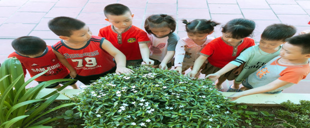 Trẻ nhận biết được một số đặc điểm nổi bật của bồn hoa: Tên các cây hoa, màu sắc, đặc điểm của một số cây hoa thân, lá - Trẻ biết ích lợi của hoa đối với đời sống con người - Trẻ được quan sát, ghi nhớ có chủ đích - Giáo dục trẻ chăm sóc, bảo vệ hoa, không hái hoa, bẻ cành Cô và trẻ hát bài: Khúc hát dạo chơi - Trước mặt chúng mình có gì? - Có những loại hoa nào? - Ai nhận xét gì về lá của cây hoa bỏng? - Lá có màu gì? - Chúng mình thử đoán xem cây hoa cúc này có hoa màu gì? - Lá hoa cúc có đặc điểm gì? - Vì sao chiếc lá này màu vàng? - Nó có xanh trở lại được không? nó sẽ thế nào? - Cây sống được và nở hoa đẹp là nhờ có gì? - Hoa trồng để làm gì? + Giáo dục trẻ chăm sóc và bảo vệ hoa, không hái hoa, bẻ cành