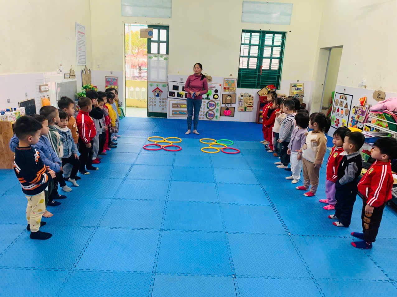 Trò chơi bật qua các ô vòng của các bé 3T2.