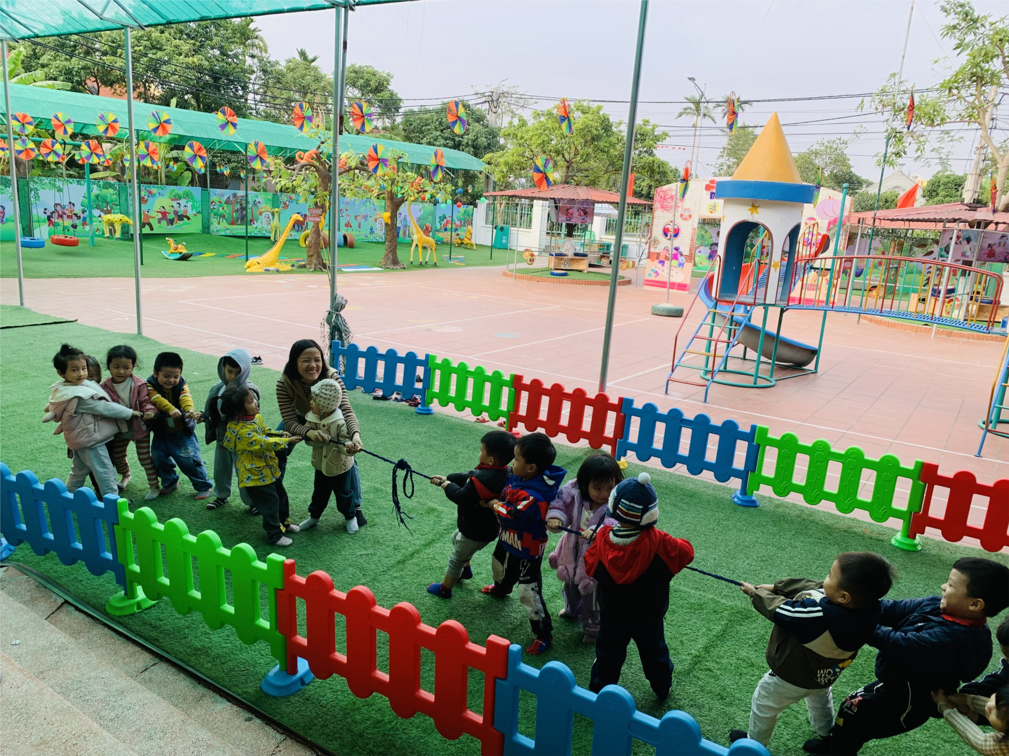 Trò chơi kéo co đối với trẻ mầm non Trò chơi kéo co là một trong những trò chơi dân gian quen thuộc và rất ý nghĩa đối với trẻ mầm non. Khi tham gia, các bé được chia thành hai đội, cùng nhau kéo sợi dây thừng về phía mình để giành chiến thắng. Trò chơi này không chỉ mang lại niềm vui mà còn giúp trẻ rèn luyện sức khỏe, phát triển thể chất thông qua các động tác kéo và giữ thăng bằng. Bên cạnh đó, trẻ học được tinh thần đoàn kết, biết phối hợp và cùng nhau nỗ lực vì mục tiêu chung. Kéo co cũng giúp trẻ phát triển sự tự tin, khả năng tuân thủ luật chơi và niềm vui khi làm việc nhóm. Đây là một hoạt động vừa bổ ích vừa mang đậm giá trị truyền thống, góp phần làm phong phú thêm tuổi thơ của trẻ.