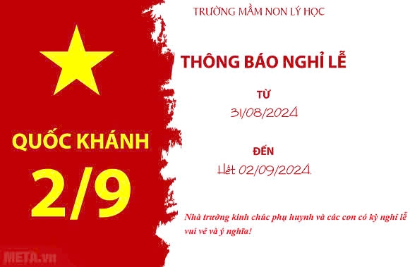 📢📢📢THÔNG BÁO NGHỈ LỄ Quốc khánh 2/9/2024🌿🌿 💕 Trường mầm non Lý Học trân trọng thông báo lịch nghỉ lễ Quốc khánh 2/9/2024🇻🇳như sau: ⏰Thời gian nghỉ: 03 ngày - Từ thứ 7 ngày 31/8/2024 đến hết thứ 2 ngày 3/9/2024. 🔸Thứ ba ngày 03/09/2024, các con đi học trở lại bình thường. 🌺🌹Kính chúc toàn thể CB- GV-NV; Quý phụ huynh, các con có một kỳ nghỉ lễ với nhiều niềm vui cùng gia đình và người thân!🥰 ♻🍀Rất mong quý phụ huynh đảm bảo an toàn cho trẻ trong thời gian trẻ nghỉ ở nhà. Trân trọng cảm ơn!