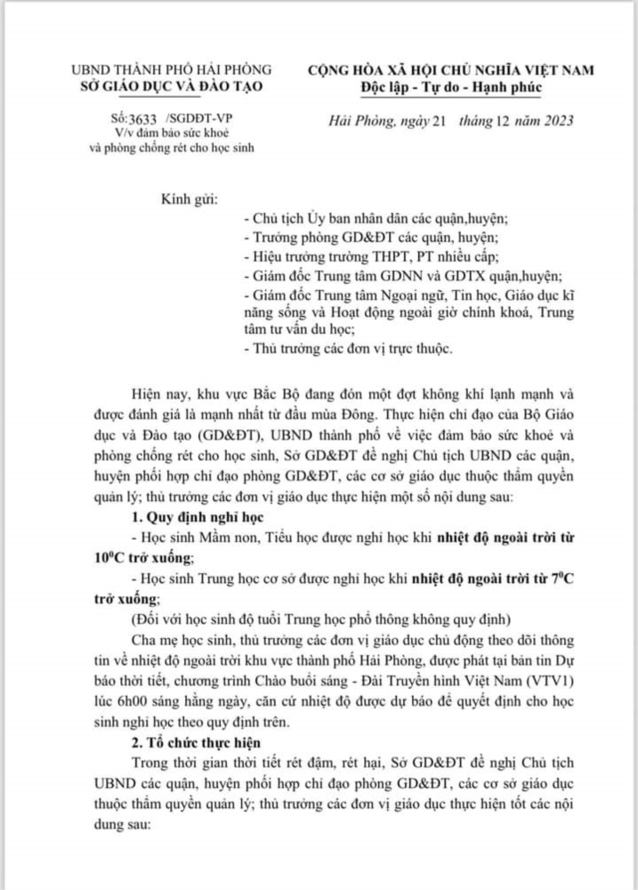 💥💥💥 Để đảm bảo an toàn sức khỏe và phòng chống rét cho học sinh, kính đề nghị các bậc phụ huynh quan tâm theo dõi bản tin dự báo thời tiết ngoài trời khu vực Hải Phòng vào 6h00 sáng hàng ngày trên kênh VTV1 - Chương trình Chào buổi sáng. Học sinh mầm non nghỉ học nếu nhiệt độ ngoài trời dưới 10 độ. Trân trọng!!!