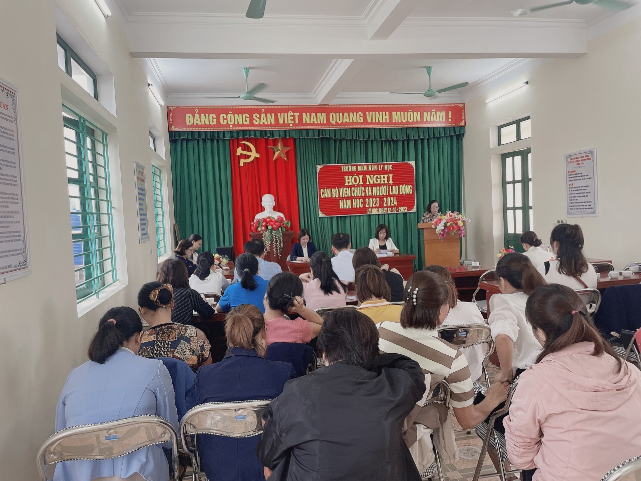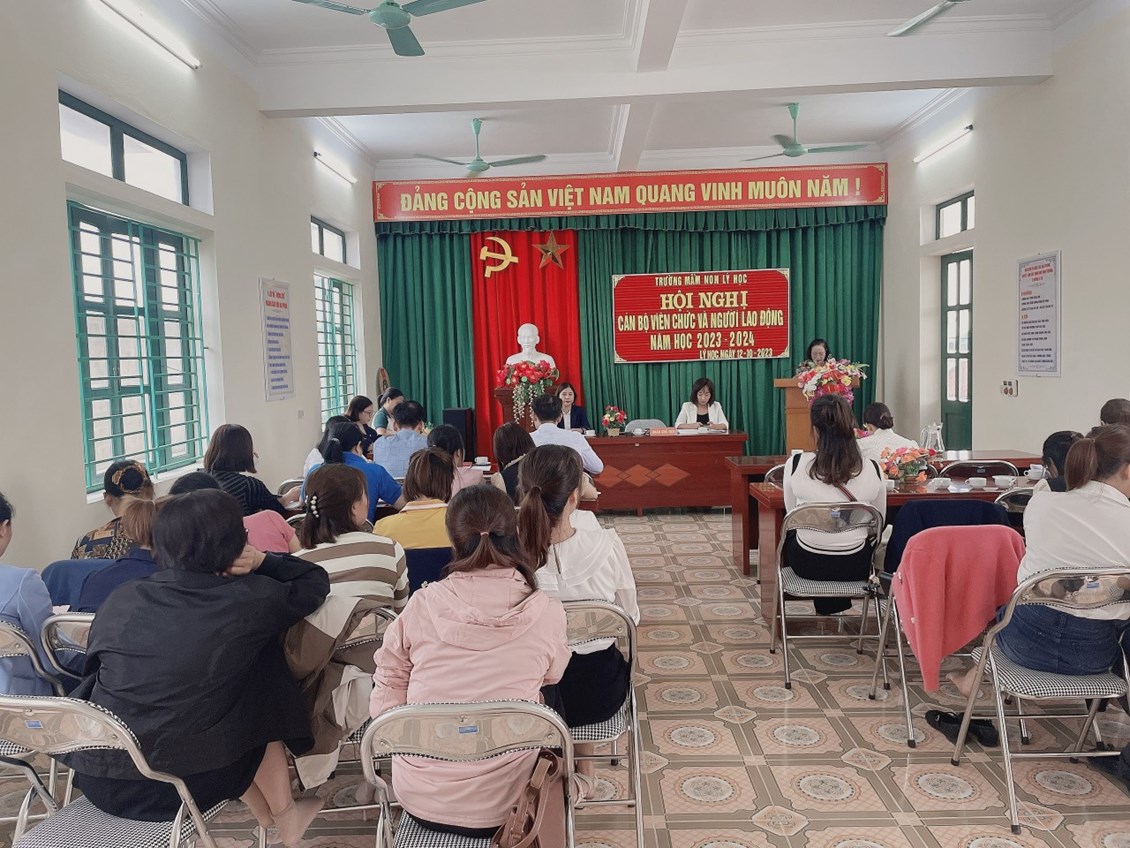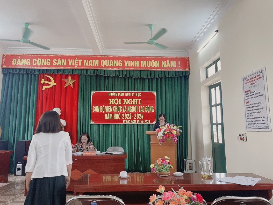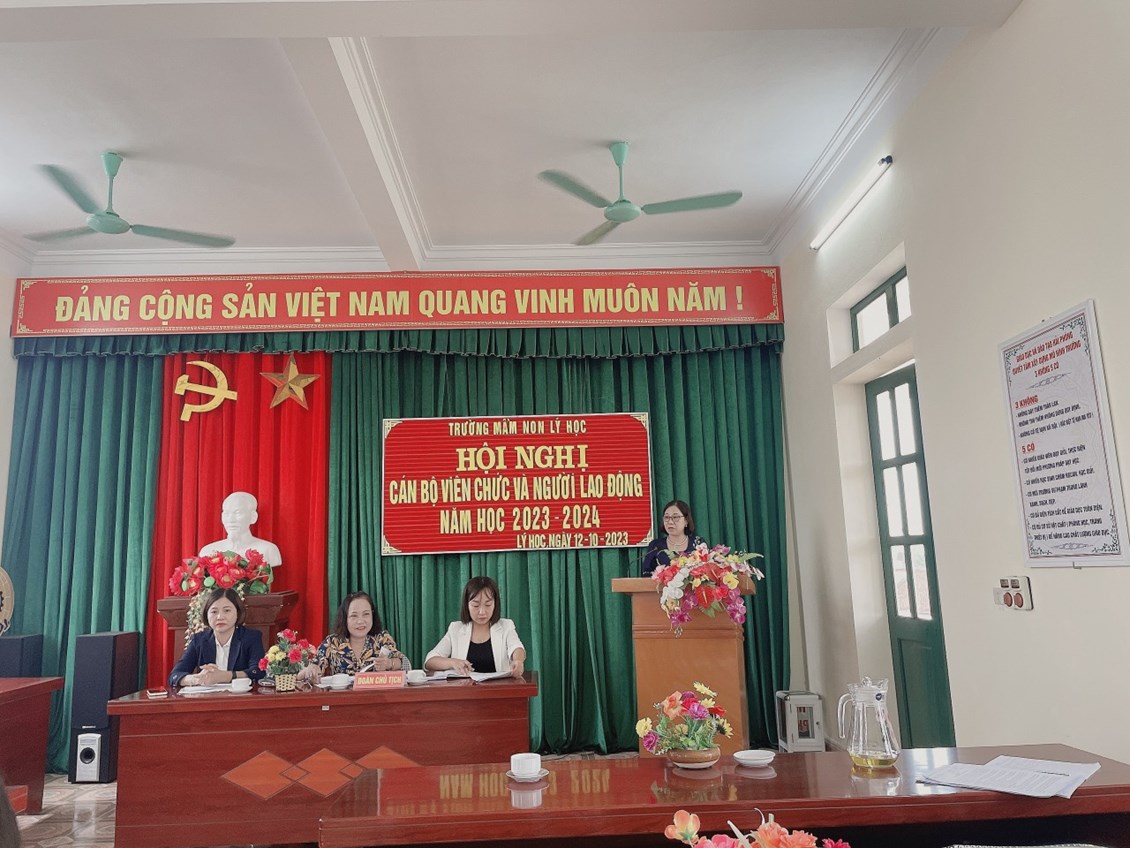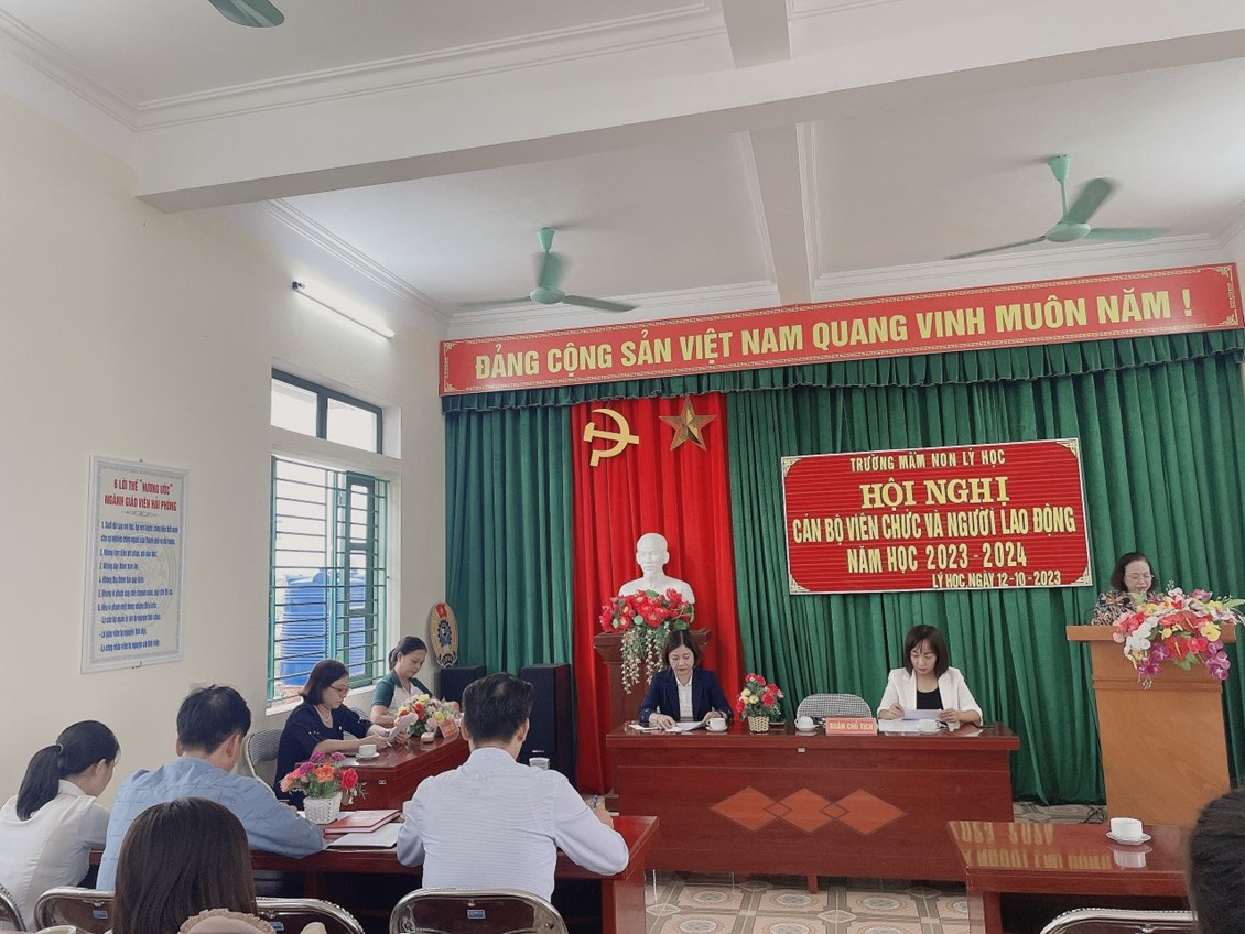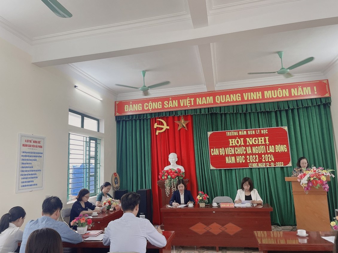 THÁNG 10 : Ngày 12/10/2023 Trường mầm non Lý Học đã tổ chức hội nghị Cán bộ, viên chức và người lao động. Về dự Hội nghị có Các ĐC đại diện cho Đảng ủy, HĐND, UBND, các Ban ngành đoàn thể, BĐDCMTE, CBGVNV nhà trường. Hội nghị đã triển khai nhiệm vụ trọng tâm và các nhiệm vụ cụ thể trong năm học. Các nhiệm vụ, chỉ tiêu, giải pháp được hội nghị thảo luận sôi nổi và trở thành tiêu chí phấn đấu của nhà trường. CBGVNV Trường MN Lý Học quyết tâm cùng nhau cố gắng vượt qua khó khăn và hoàn thành thật tốt nhiệm vụ năm học. Thay mặt BCH công đoàn trường Mầm non Lý Học xin kính chúc quý vị đại biểu, sức khỏe, bình an, hanh phúc.Chúc Ban đại diện cha mẹ trẻ mạnh khỏe, thành đạt luôn đồng hành cùng CBGVNV trong công tác CDNDGD trẻ. Chúc các bé khỏe mạnh, chăm ngoan, siêng học. Chúc các ĐC CBGVNV mạnh khỏe, bình an, đoàn kết, đồng lòng hoàn thành tốt nhiệm vụ năm học 2023-2024!
