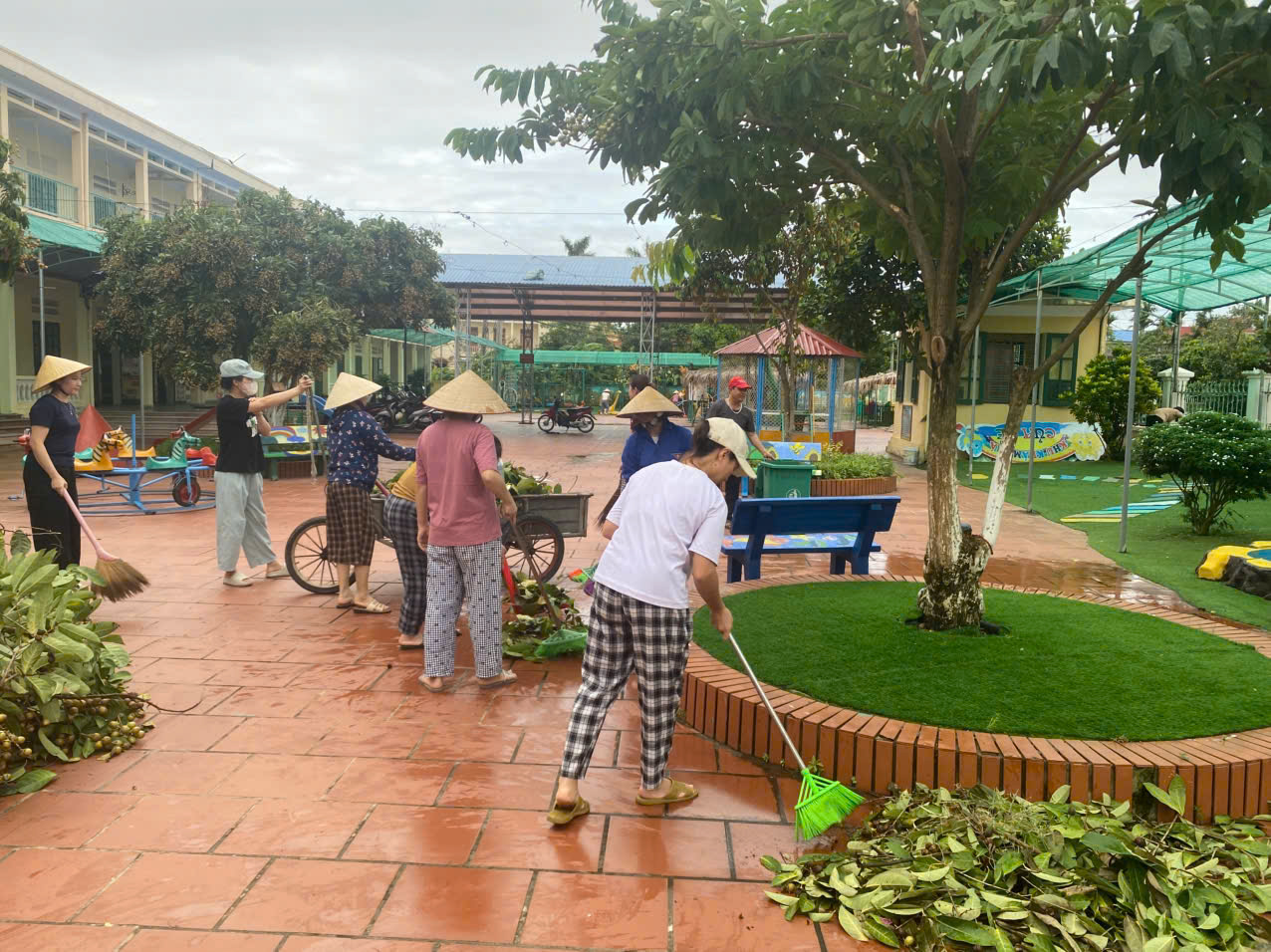 Trường mầm non Lý Học tổ chức lao động, dọn vệ sinh sau cơn bão số 3 Wipha.