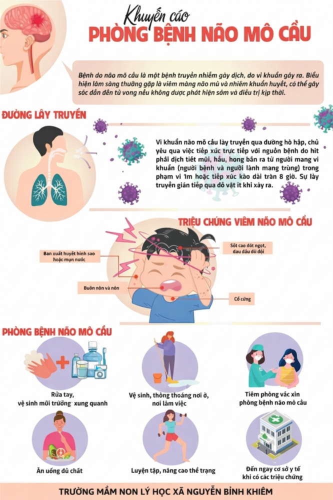 Các bạn học sinh và Quý phụ huynh thân mến, Viêm não mô cầu là một bệnh truyền nhiễm cấp tính nguy hiểm, có thể gây ra những biến chứng nặng nề nếu không được phát hiện kịp thời. Để "lá chắn" sức khỏe luôn vững vàng, hãy cùng nhà trường điểm qua những kiến thức quan trọng sau đây: ❓ Dấu hiệu nhận biết "kẻ lây nhiễm": 🌡️ Sốt cao đột ngột, rét run. 🤕 Đau đầu, buồn nôn, nôn mửa. 🧣 Cổ cứng, đau gáy. 🩺 Xuất hiện ban đỏ hoặc ban xuất huyết trên da (lan rất nhanh). 🌬️ Bệnh lây qua đường nào? Vi khuẩn lây truyền chủ yếu qua đường hô hấp khi: Ho, hắt hơi, nói chuyện gần hoặc dùng chung đồ cá nhân. 🛡️ 5 quy tắc "vàng" để phòng bệnh: 💉 Tiêm vắc-xin đầy đủ: Đây là biện pháp phòng bệnh hiệu quả nhất. 🧼 Rửa tay sạch sẽ: Luôn giữ đôi tay sạch khuẩn sau khi học tập, vui chơi. 🍽️ Ăn uống vệ sinh: Ăn chín, uống sôi, không dùng chung ly, bát đũa. ↔️ Tránh tiếp xúc gần: Hạn chế tụ tập nơi đông người khi có dịch. 🏥 Đến y tế ngay: Khi có dấu hiệu nghi ngờ, hãy báo ngay cho thầy cô, cha mẹ và đến cơ sở y tế gần nhất. 💪 Phòng bệnh hơn chữa bệnh! Hãy cùng nhau thực hiện tốt các biện pháp trên để bảo vệ chính mình và cộng đồng nhé!