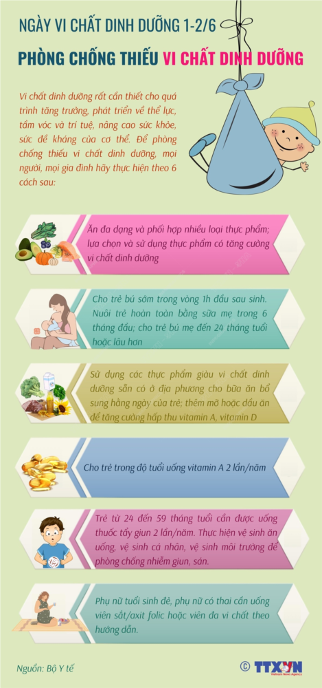 Theo Bộ Y tế, để phòng chống thiếu vi chất dinh dưỡng, bên cạnh giải pháp ngắn hạn là uống bổ sung các sản phẩm vi chất dinh dưỡng (như viên nang vitamin A liều cao, viên đa vi chất…), giải pháp trung hạn là sử dụng thực phẩm tăng cường vi chất dinh dưỡng, thì giải pháp lâu dài và cơ bản là cải thiện chất lượng bữa ăn. Do đó, cần tăng cường công tác truyền thông, khuyến khích người dân sử dụng đa dạng, phối hợp nhiều loại thực phẩm cho bữa ăn hằng ngày; ưu tiên lựa chọn và sử dụng thực phẩm giàu vi chất dinh dưỡng và thực hiện nuôi con bằng sữa mẹ hoàn toàn trong 6 tháng đầu, theo khuyến cáo của Tổ chức Y tế thế giới và Bộ Y tế.