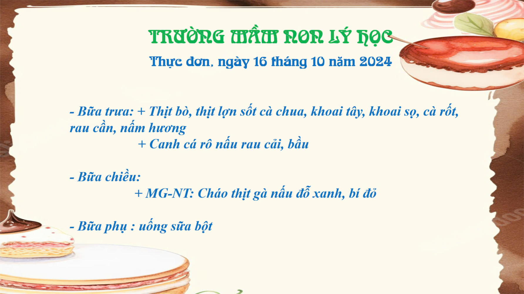 Thực đơn bữa ăn ngày 16 tháng 10 năm 2024 của trẻ