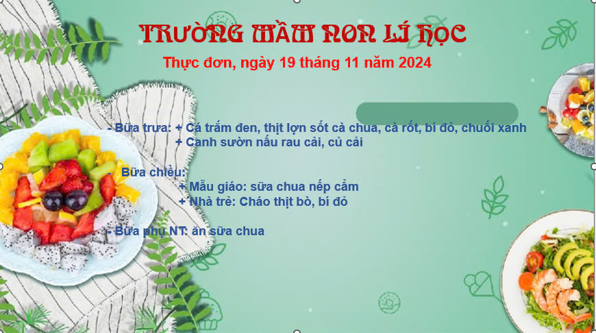 Thực đơn bữa ăn được chuẩn bị rất phong phú và cân đối dinh dưỡng. Bữa chính gồm các món như cá, thịt, sốt cà chua, cà rốt, bí đỏ, chuối xanh, canh sườn, lẩu rau với các loại rau bắp cải và củ cải. Bữa chiều, trẻ mẫu giáo được ăn sữa chua nếp cẩm, trong khi trẻ nhà trẻ ăn cháo thịt bò nấu cùng bí đỏ. Bữa phụ dành cho trẻ nhà trẻ cũng bổ sung thêm sữa chua nếp cẩm. Đây là thực đơn giàu chất đạm, chất xơ và vitamin, đảm bảo sự phát triển toàn diện và cung cấp đủ năng lượng cho các bé.​16:14/-strong/-heart:>:o:-((:-hĐã gửi Xem trước khi gửiThả Files vào đây để xem lại trước khi gửi
