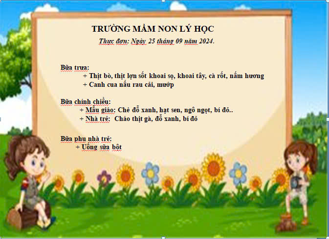 Thực đơn của trẻ ngày 25 tháng 09 năm 2024 của Trường mầm non Lý Học.