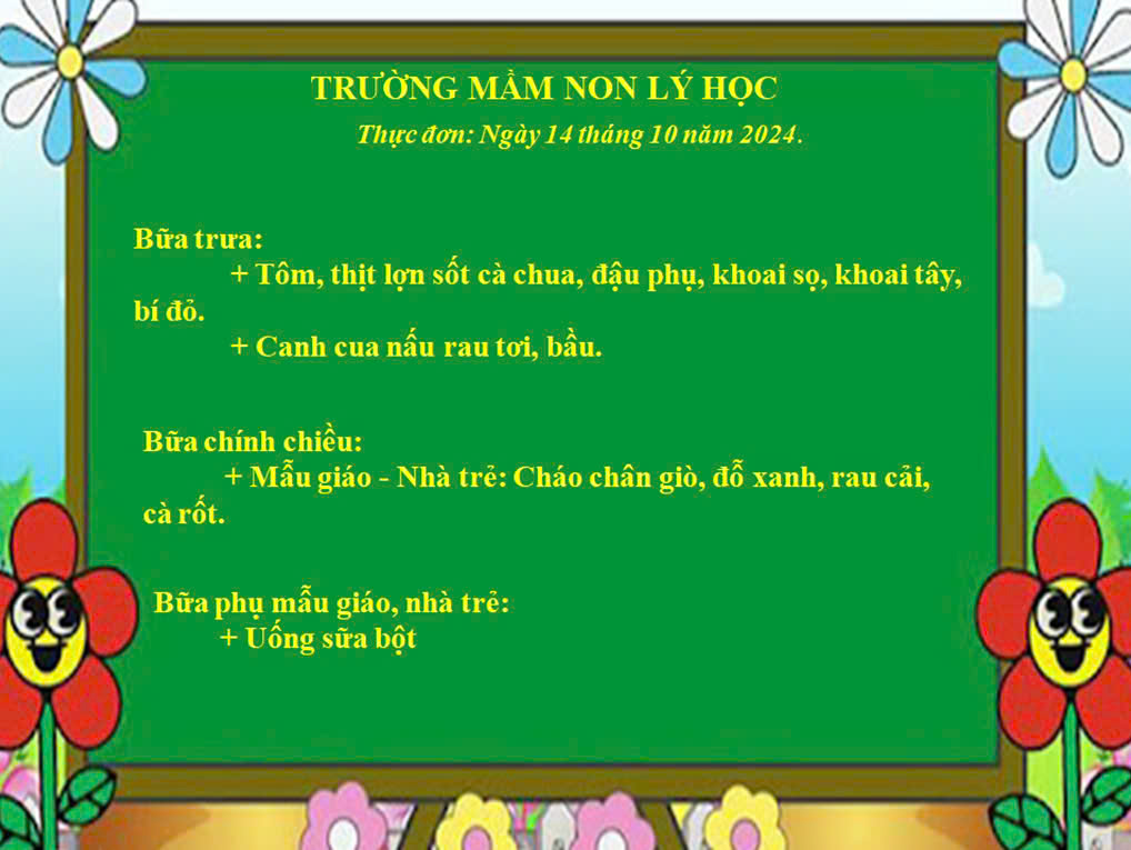 Thực đơn ngày 14 tháng 10 năm 2024 của trường mầm non Lý Học.