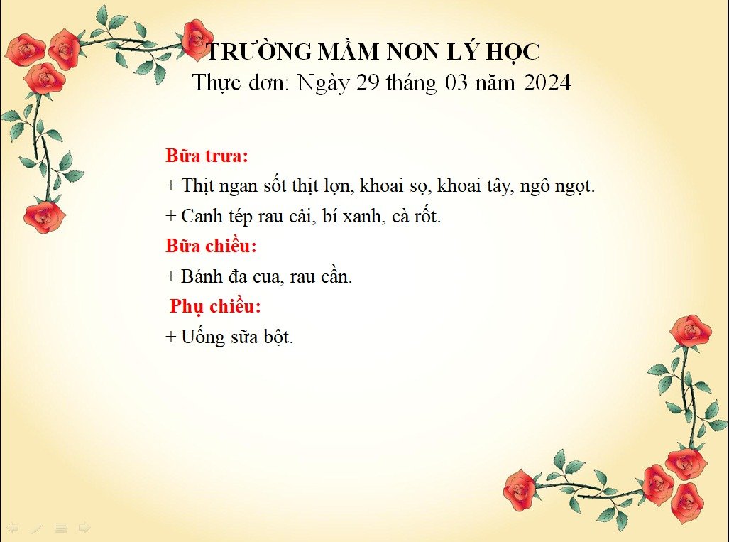 Thực đơn trường mầm non Lý Học ngày 29/3/2024