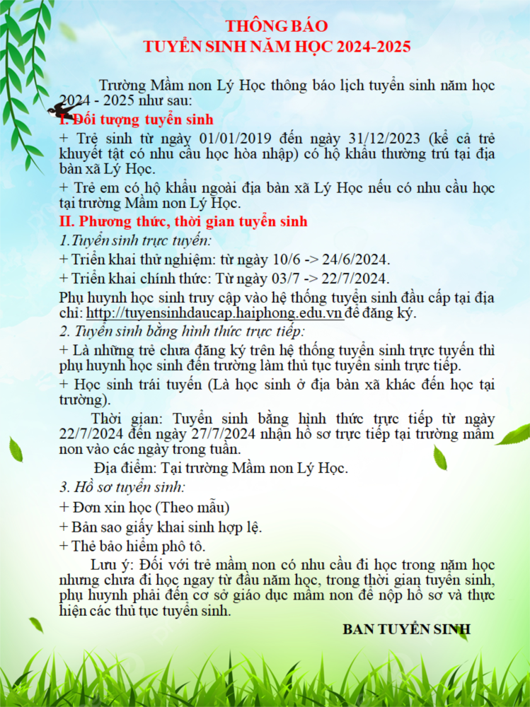 Trường mầm non Lý Học trân trọng thông báo kế hoạch tuyển sinh năm học 2024-2025