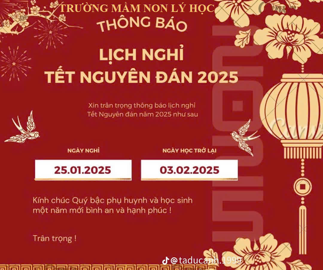 TRƯỜNG MẦM NON LÝ HỌC XIN THÔNG BÁO TỚI TOÀN THỂ CÁC BẬC PHỤ HUYNH VÀ CÁC CON LỊCH NGHỈ TẾT NGUYÊN ĐÁN 2025